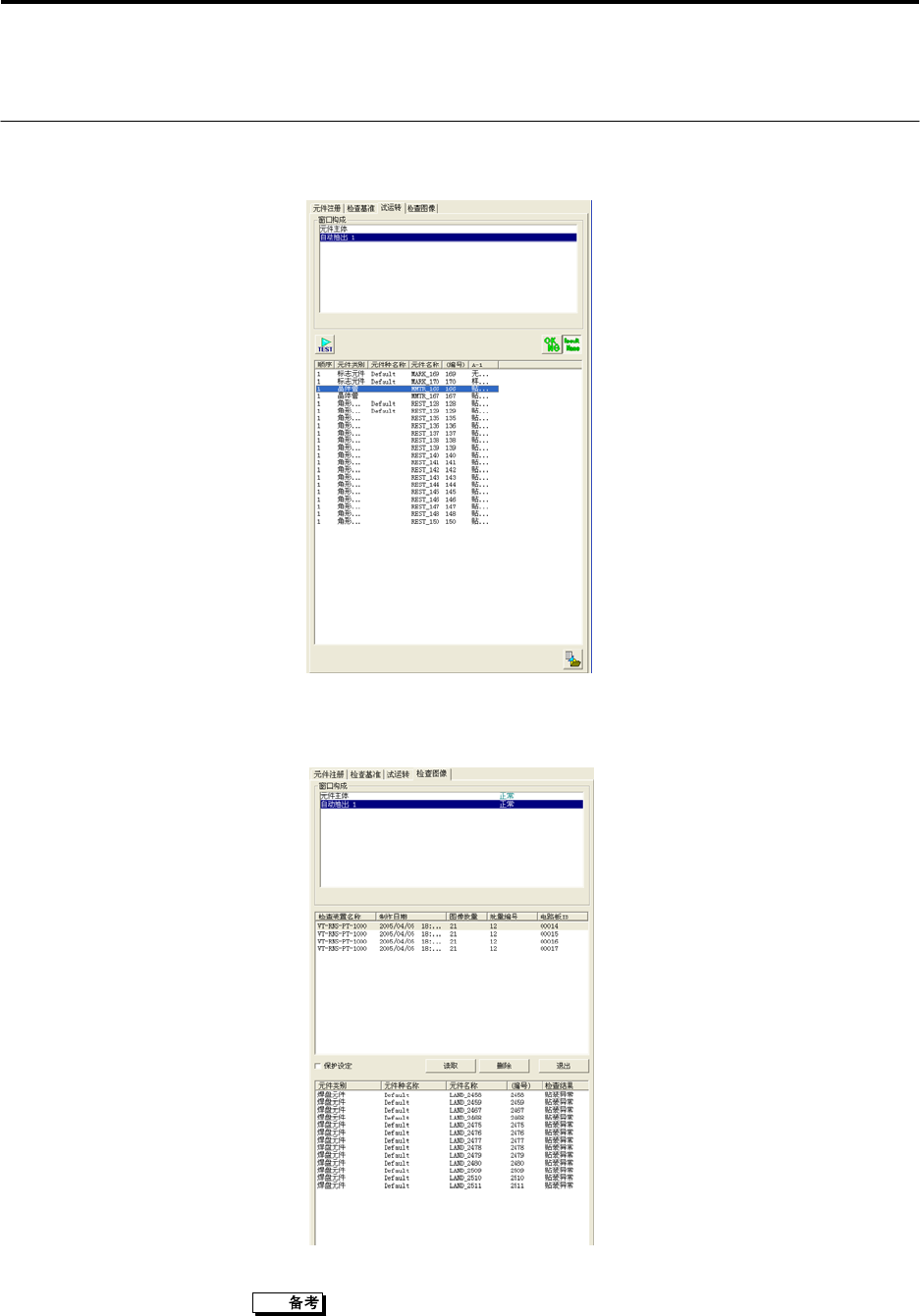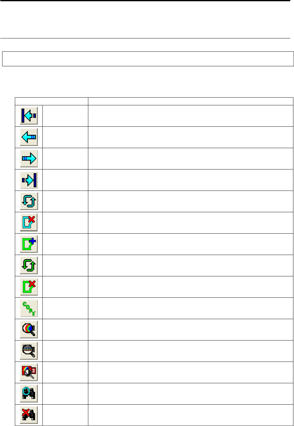 第 2 章 检查程序的制作 2-10 2.1.3 指令的机能一览 对主要的指令按钮及其机能进行说明 。 平常显示 移动条件选择 设定移动元件的焦点的条件。 从所有元件类别、 同样元件种、 同样元件类别中选择。 最前面的元件 将焦点移动到检查程序所粘贴的最前面的元件。请预先设定移动条件。 前一个元件 将焦点移动到前一个元件。 聚焦的顺序为粘贴元件时的顺序。 请预先设定移动条件。 下一个元件 将焦点移动到下一个元件。 聚焦的顺序为粘贴元…