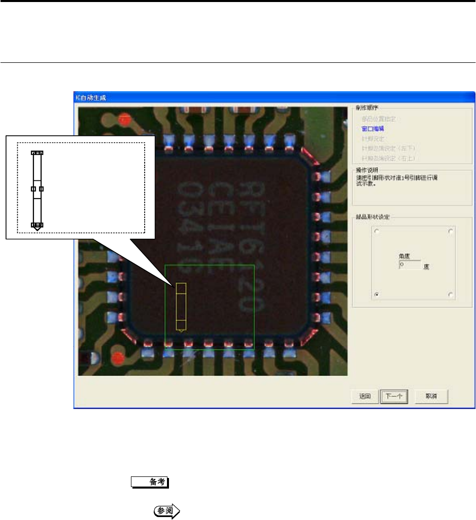 2.4 制作检查程序 2-43 显示电路板图像和制作向导。 ・ 在此单击[取消],返回 3. 中单击[ 粘贴]前的状态。 ・ 不能执行[返回]的操作。 4. 单击[↑][←][→][↓],移 动摄像位置,使其能够显 示 1 号引 脚。 5. 单击[下一步]。