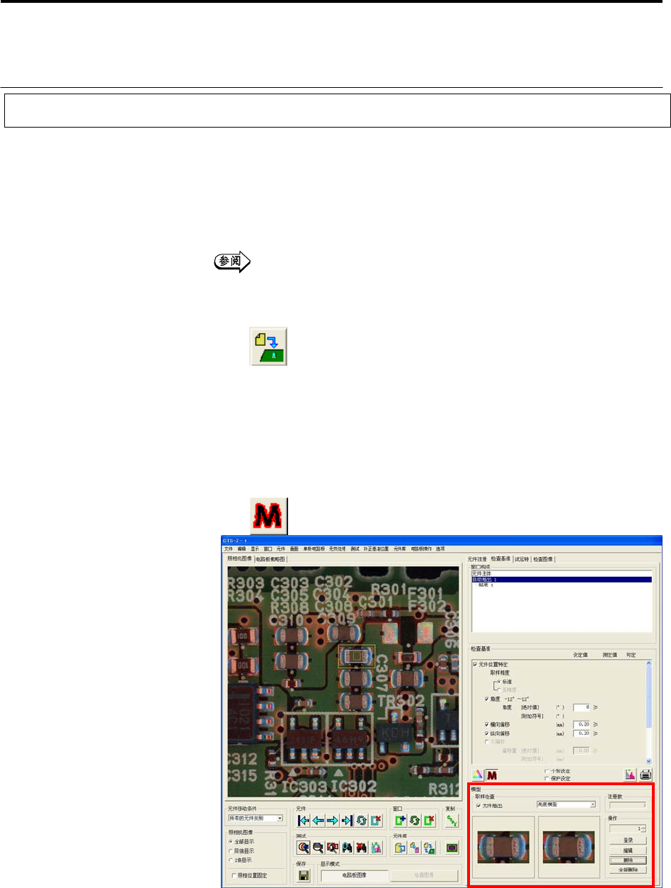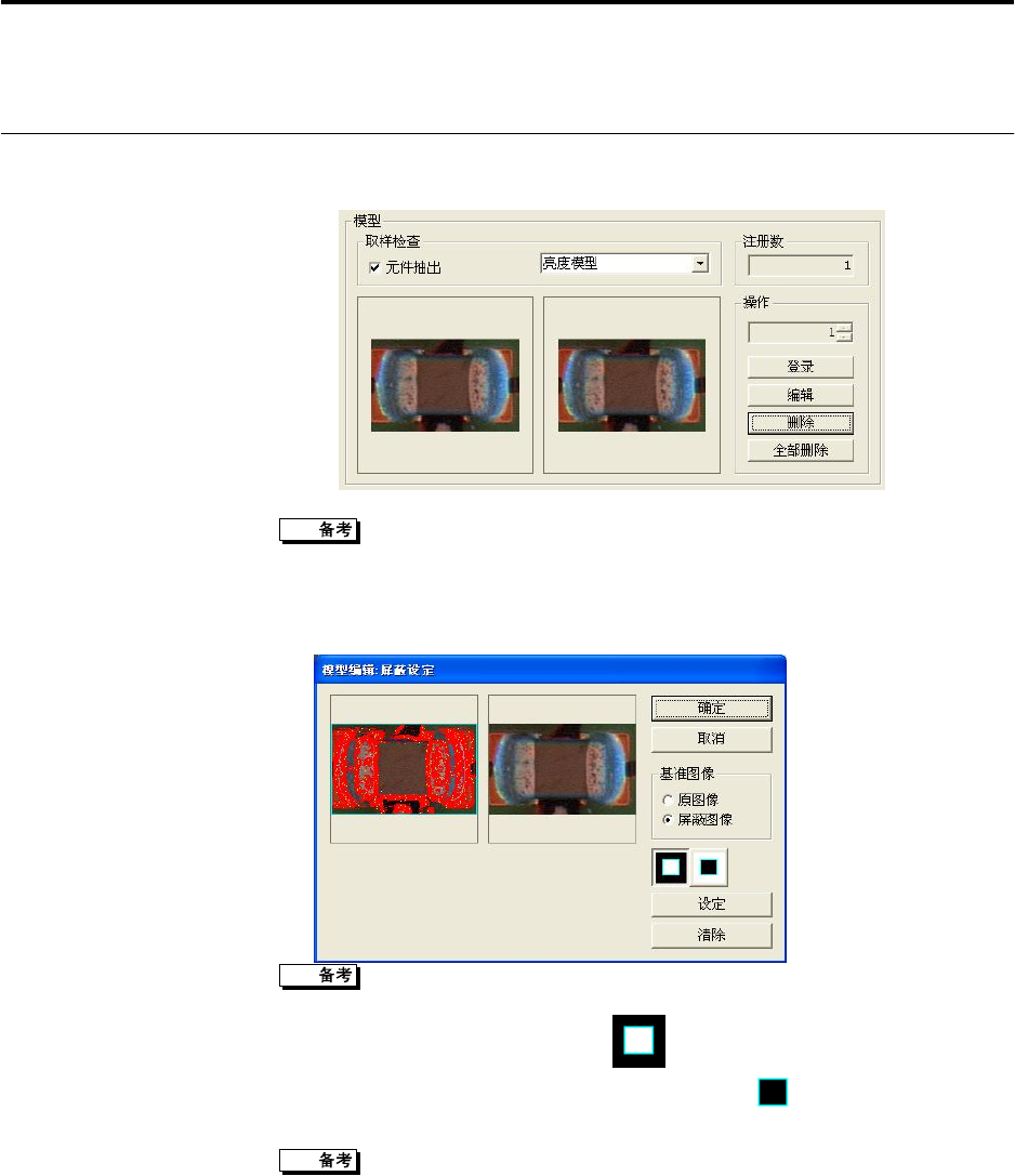 第 2 章 检查程序的制作 2-54 8. 在此单击 [ 登录 ] 。 显示自动抽出窗口内的图像。 左侧的图显示的是自动抽出窗口内的图像。右侧的图显示的是所登录的模 型数据。 9. 对模型数据进行编辑。单击 [ 操作 ] 的 [ 编辑 ] 。 10. 显示「模型编辑及屏蔽设定」对话窗 。 红色部分显示的是被抽出的边缘。 11. 选择屏蔽设定的方法。选择 时,用左 方图像上的蓝色线拖拽并围 起要作为模型数据登录的领域。 并且, 选择 时,…
