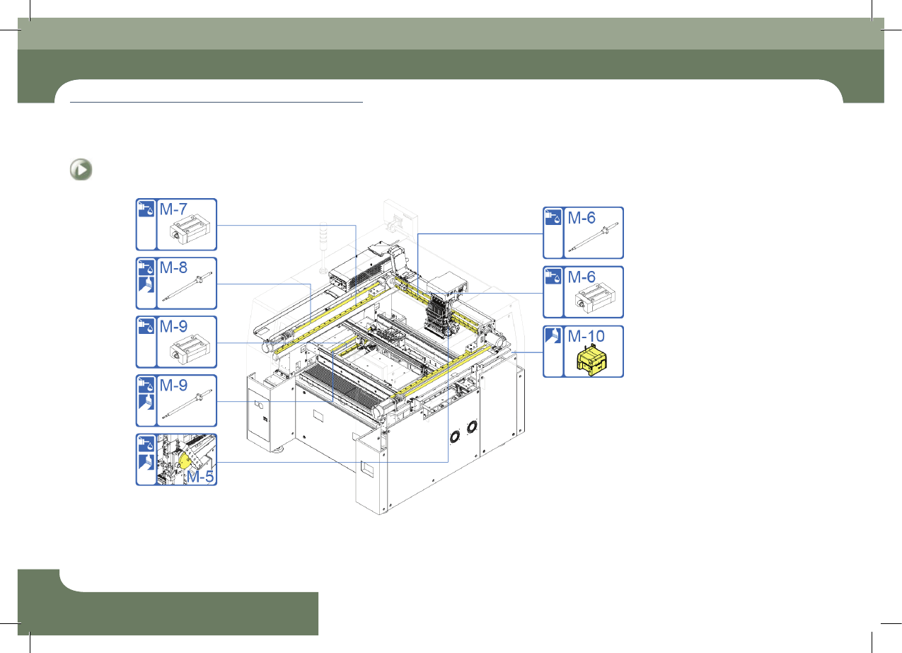 Chap ter 2 维修检验事项 Fas t Fl ex ib le P la cer SM481 PLUS Maintenance Handbook 2 -7 每月检查项目 (2/2) 注油项目 Grease list (规格) 参考事项 所需时间 注油周期 No. 注油项目 注油事项 工具 每月 M - 5 Head Spindle 、 Mirror CAM 清扫及涂抹 刷子、布块 GREASE GADUS S2 V220 - 2…