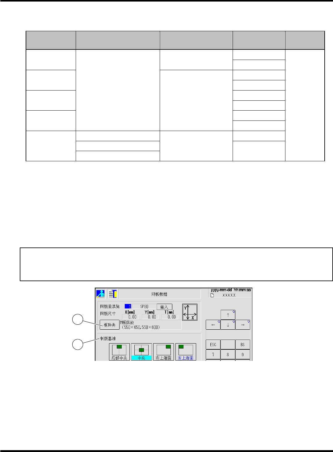 SP 80/SP 60 参考手册 1.5 网板框重组步骤 Page 1-15 SP 80V-L, S P60P -L: L 尺寸机器 ( 标准规格 : 流向为左 → 右,前侧基准 ) 丝网网板 种类 丝网网板 尺寸 对应的最大 基板尺寸 制版基准 (Y 方向 ) 制版基准 (X 方向 ) 中心 29 英寸框 (L 尺寸基准 ) 510 m m × 460 m m (L 尺寸 ) 前侧 中心 29 英寸框 (D 尺寸基准 ) 前侧 中…