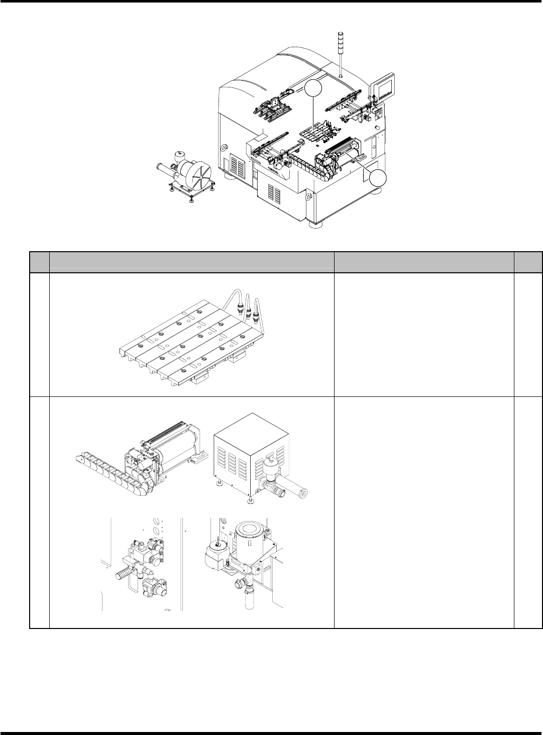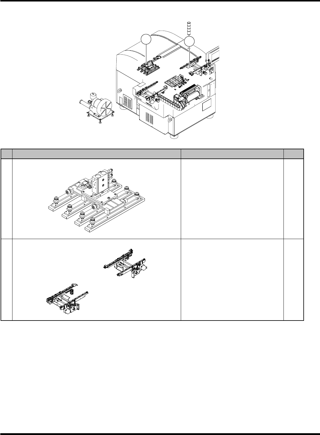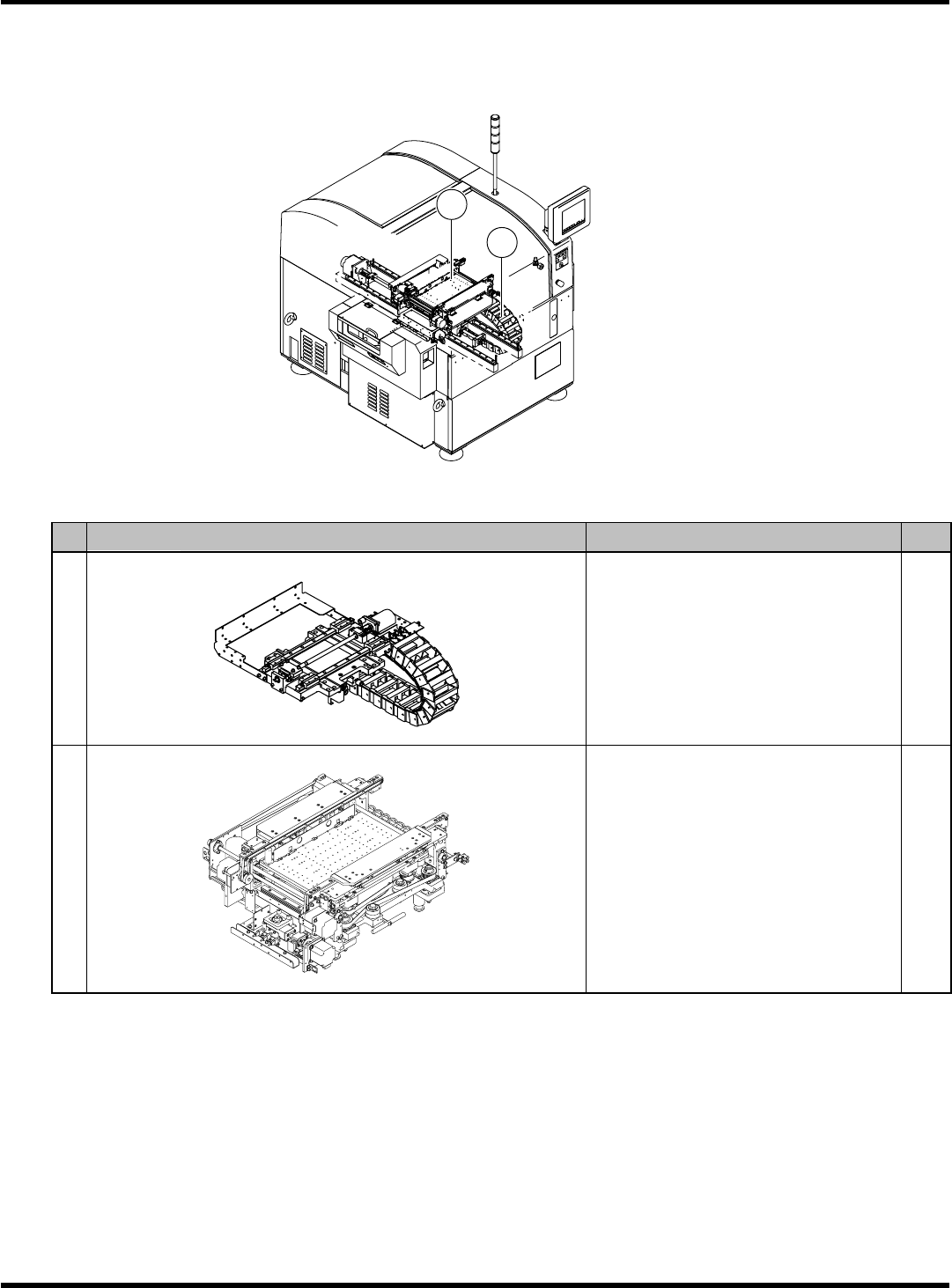 SP 80/SP 60 参考手册 1.1 各部的名称和功能 Page 1-6 主要装置 ( 正视图 3/4) No. 装置名称 功能 数量 基板上压紧装置 1D3C-X039MA 有基板夹具时,压着基板,防 止基板浮 起。 1 搬送传送带 ( 左·右 ) 1D3C-X039K 进行从前工序搬入基板和向后 工序搬出 基板的操作。 1 1D3C-BA 1 2 1E3C-C- RMA01- A01-00