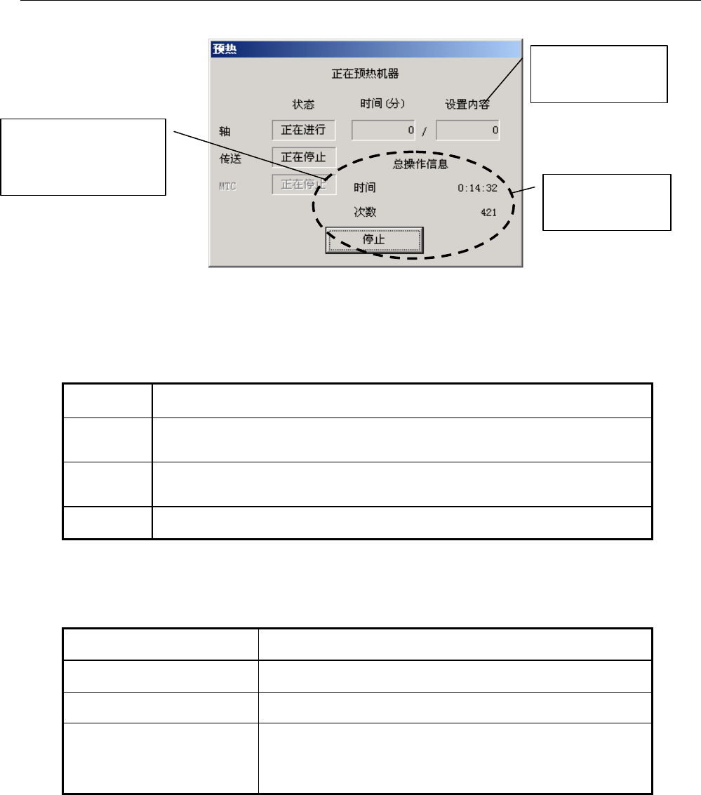 第 1 部 基本篇 第 2 章 生产 2- 20 2-4-3 运行内容 预热运行期间, 显示下列画面。 图 2-4-3-1 运行中的画面 选择对象后,开 始执行下列预热 动作 表 2-4-3-1 预热运行内容 运行对象 运 行 内 容 轴 运行 XYZ θ 轴马达和 ATC 滑板、鼓风 机。但 ATC 滑板动作,在 反复开、关 10 次后自动结束。 鼓风机运行后反 复 ON 、 OFF10 次后也自动结束。 传送 运行传送 马达、支撑台…