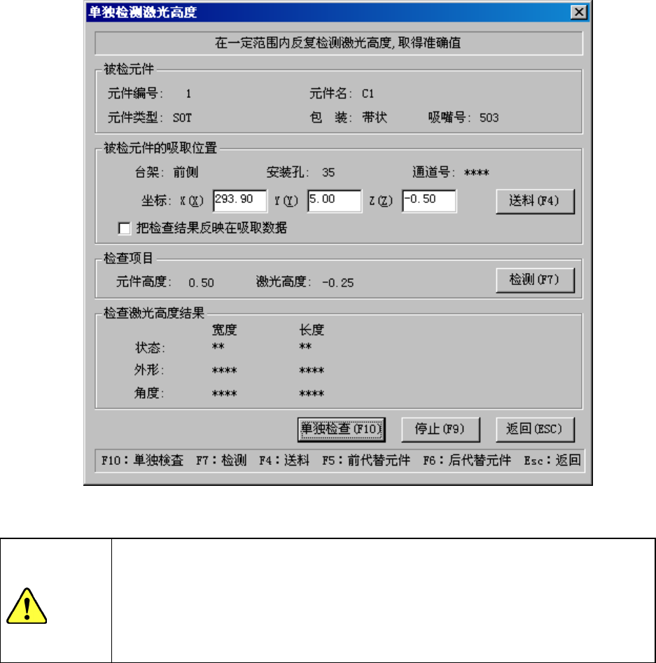 在连续检查中出现错误转换为单独检查时,会显示如下的激光高度单独检查画面。