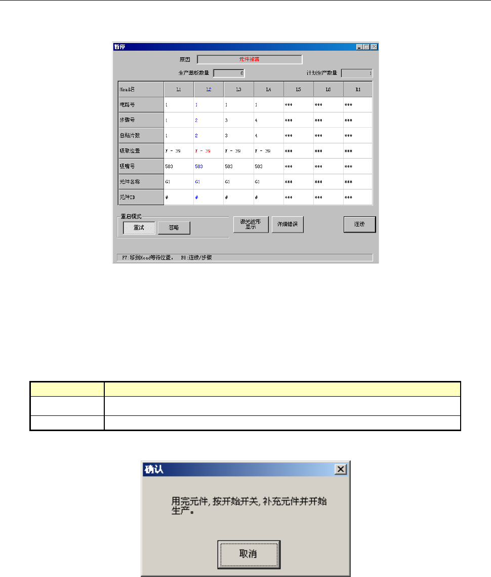 忽略 忽略发生错误的元件的吸取贴片循环,从下一个吸取循环重启生产。