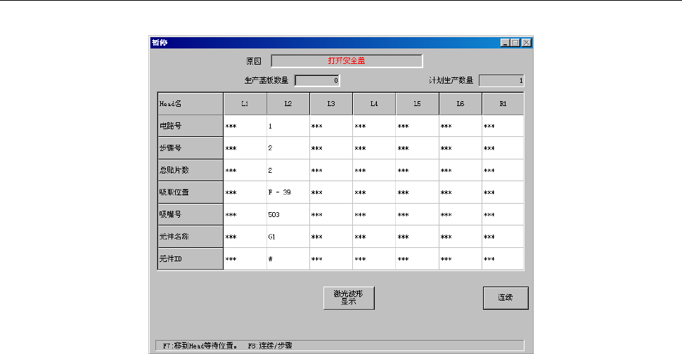 在生产运行中打开安全盖时,会显示如下画面,并进入暂停状态。