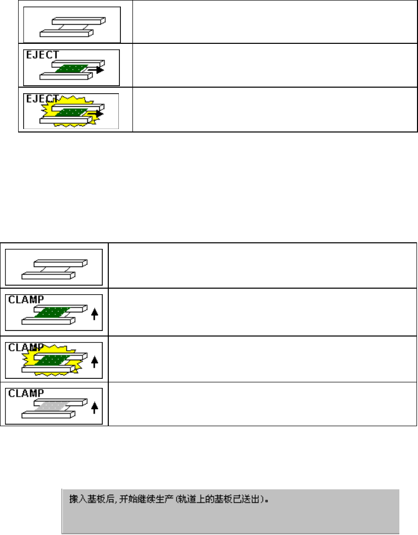 第 1 部 基本篇 第 2 章 生产 2- 125 ① 选择“搬入基板 后生产”时 用图像显示停止 传感器获得的通 道上的搬出站 台的状态。 点击该图像,将 在该站台上的基 板安装到重夹 位 置。 传送通道上没有 基板。 从传送通道上搬 出基板。 生产中断时传送 通道上有基板, 但全部元件的贴 片操作已完 成,需要搬出。 从传送通道上搬 出基板。 但可能有缺件或 误贴片,在搬出 基板时需要充 分注意。 ② 选择“运行重夹 后生产”时 用…