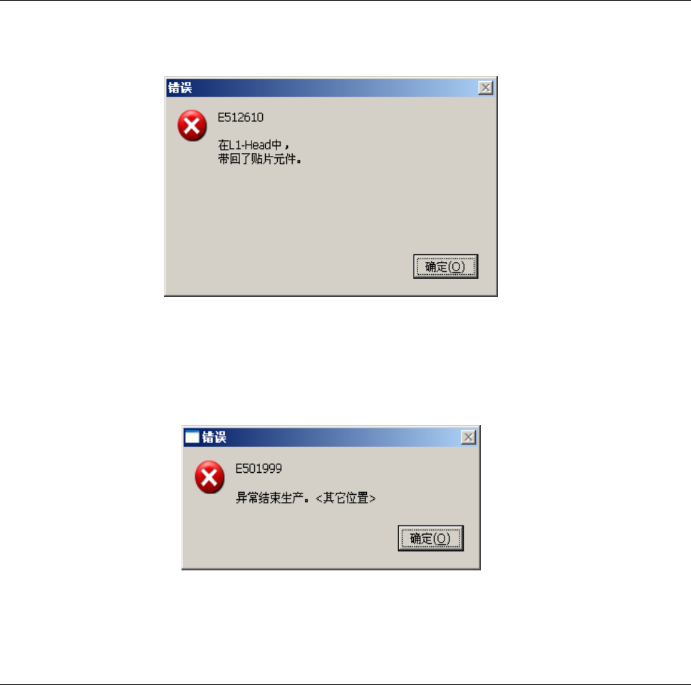 第 1 部 基本篇 第 2 章 生产 2- 148 2-11-17 带回了贴片元件 元件贴片后,在 吸取位置移动时 用激光检查吸 嘴尖端部,确认 是否带回元件 。若发现带回元 件, 可能造成贴片错 误,会显示错误 信息,并结束 生产。 图 2- 11 -17-1 检查带回 元件错误信息 选择“确定”后 ,会显示异常结 束生产的信息 。 选择 “确定” 后结束生产。 错误发生后, 请检查 吸嘴尖端是否 附着元件。 并检查所使用的吸 嘴是 …