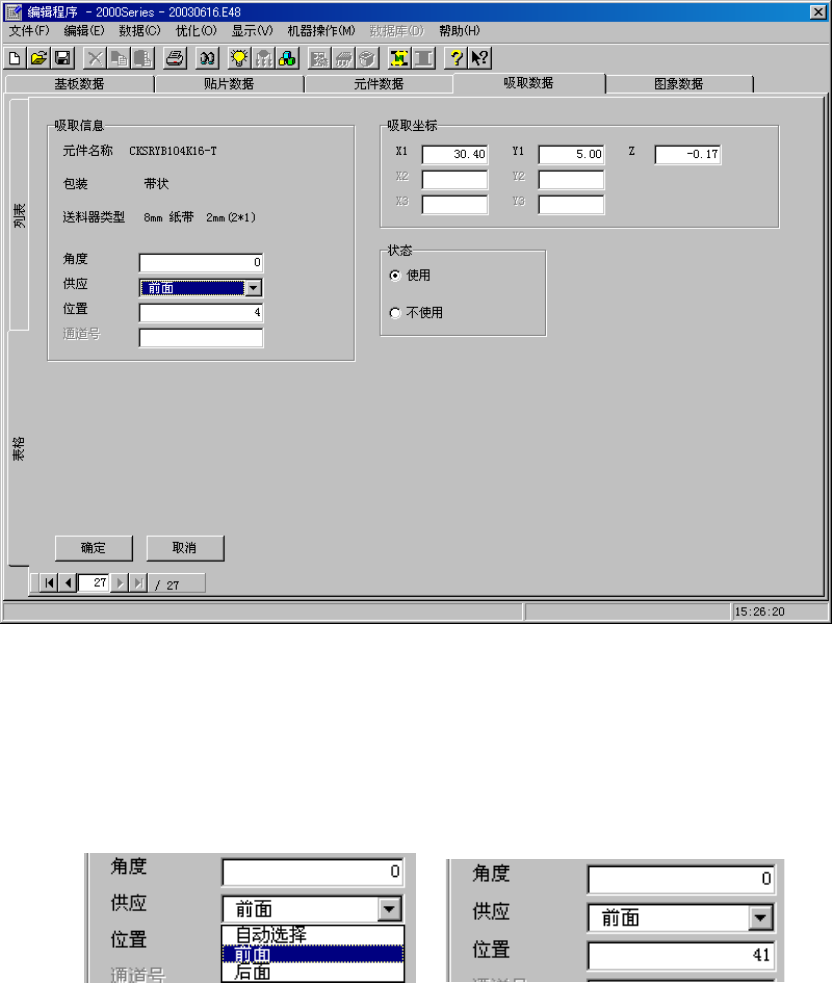 设置“前面”或“后面”后,即可输入“角度”、“位置”、“送料器类型”、“通道”(仅限