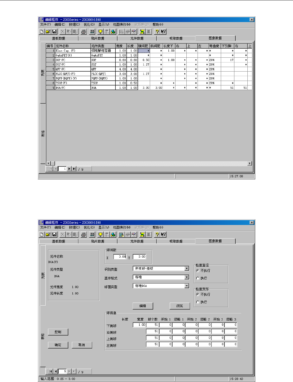 第 1 部 基本篇 第 4 章 制作生产程序 4- 86 4-3-7-3 设置项目 QFP 、连接器等的 引脚元件采用 俯视图, B GA 等球面元件采 用仰视图来制 作。 <QFP( 俯视图 )> <BGA> 4-3-7-3-1 “元件名”、“元件 种类”、“元件尺寸 ( 横、纵 ) ” 显示“元件数据 ”中已输入的值 。变更时,请 用“元件数据 ”进行。 4-3-7-3-2 间距 (X 、 Y) 输入引脚间或…
