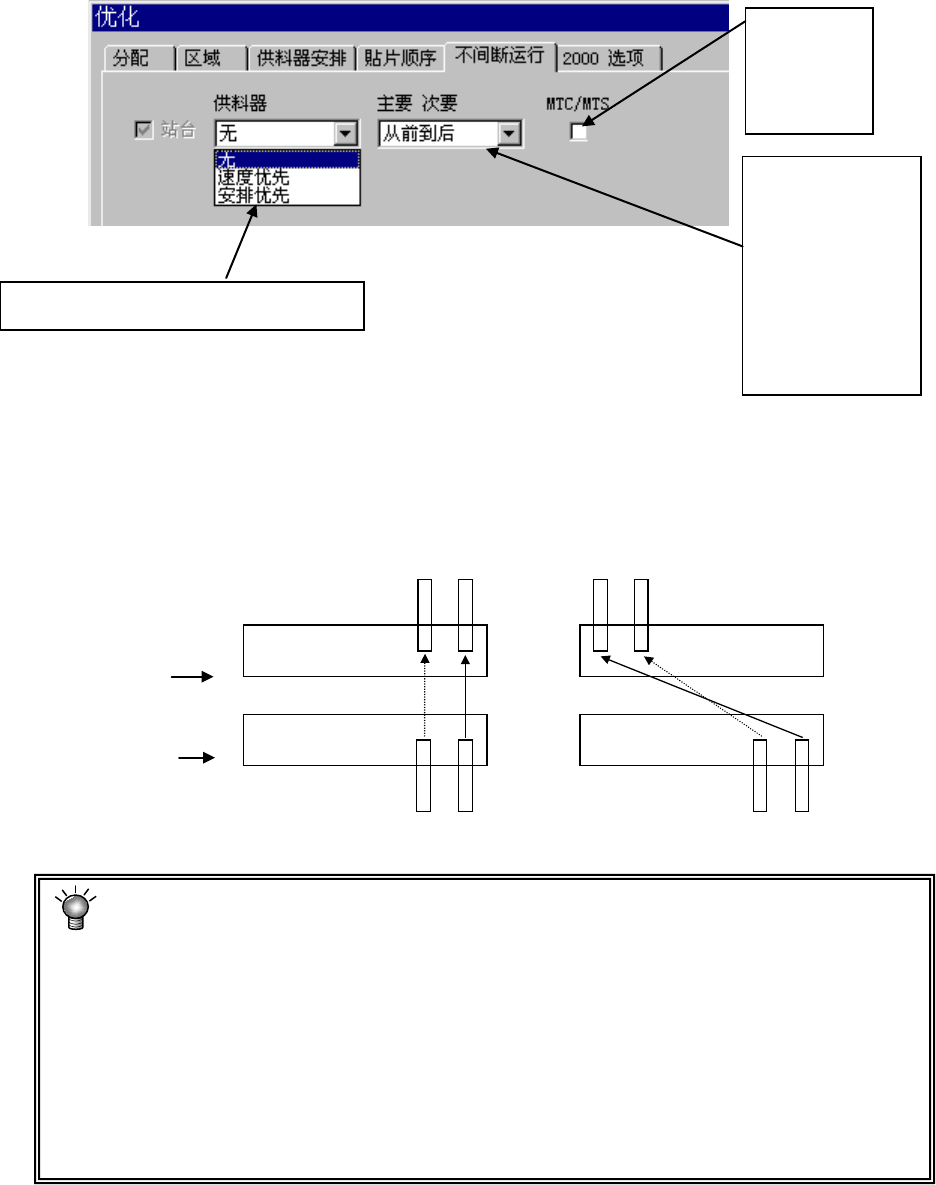 第 1 部 基本篇 第 4 章 制作生 产程序 4- 122 4-4-1-2-5 不间断运行 ( 出厂选项 ) * KE-2070C 除外。 只有配装了“不 间断运行选项” 时,下列设置 才有效。 无需进行“站台 ”设置。 图 4-4-1-2-5-1 ● 无: 不执行不间断运行。 ● 速度优先: 设置为速度优先的元 件配置。 ● 安排优先: 设置为准备优先的元 件配置。 ( KE-2080/2080 R 时不能选择。 ) ※ 1 不间断…