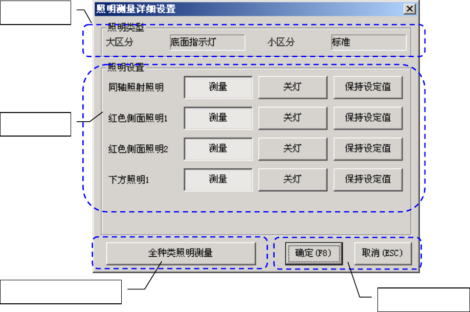 第 1 部 基本篇 第 4 章 制作生产程序 4- 194 2) 照明测量详细设 置 对照明项目进行 个别设置 , 取得 最佳照明条件 . 图 4-5-4-3-4- 3 照明测 量详细设置对 话框 ① 照明类型 : 显示照明数 据里设置的照 明大、小区分。 ② 照明设 置: 显示照明区分列 表, 每项照 明都配有 [ 测量 ] 、 [ 关灯 ] 、 [ 保持设定值 ] ( 以下 简 称 [ 保持 ] 按钮 ) 按钮。 [ 测量 ] 、 …