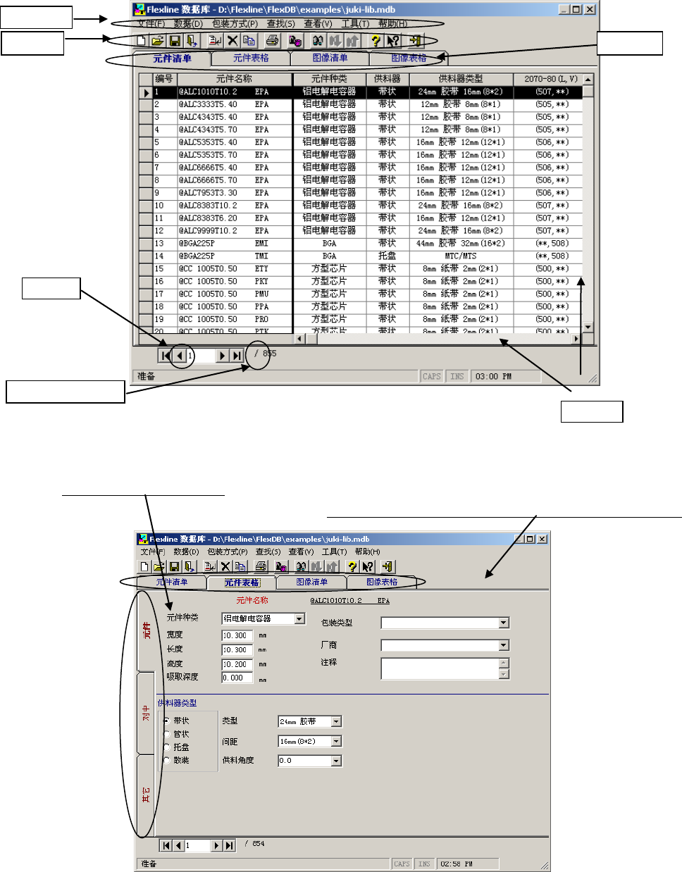 进行清单与表格的切换,元件数据与图像数据的切换。