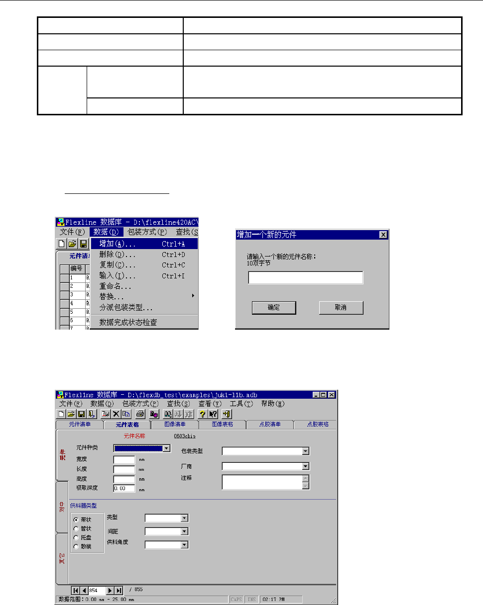 第 1 部 基本篇 第 5 章 数据库 5-9 5-1-3 制作与编辑元件数据(包括图像数据) 新建、编辑元件 数据的方法有以 下几种。 设定项目 内 容 增加 新输入元件名, 制作元件数据。 复制 不改变已经制作 的元件数据内容 ,仅用其他名 复制。 注册 在数据库中注册 将生产程 序文件、 或已注册到 其它数据库 的元件数据全部 统 一注册到数据库 。 在程序编辑中注 册 将生产程序 文件的元件数 据逐一进行注册 。 5-1-3-1…