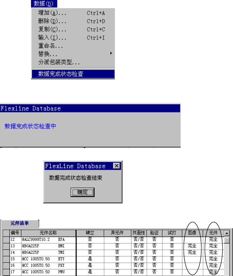 这项功能可对读入 Flexline 数据库的元件及图像数据的完成状态,进行再次检查。