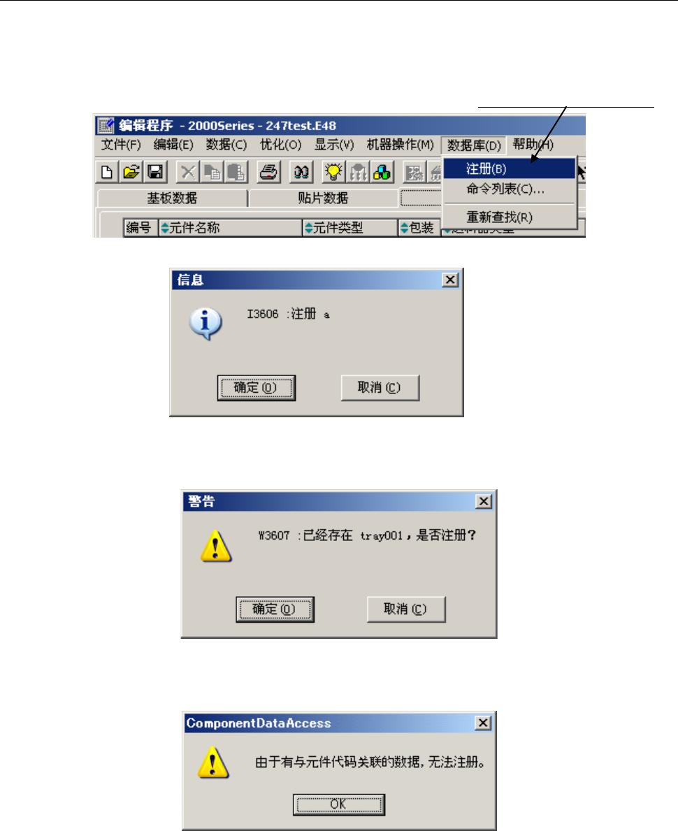 第 1 部 基本篇 第 5 章 数据库 5- 41 5-2-2 元件数据的注册(元件数据库) 在“编辑程序” 里对生产程序文 件的元件数据 逐一进行注册。 < 步骤 > ① 打开“编辑 程序”的“元 件数据” 。 ② 选择要注册 的元件 ( 若是 清单画面,请 先单击元件所 在行 ) ,再 单击“数据库” / “注册” 。 ③ 显示如下画面 ,单击“ 确定 ”,即 可完成注册。 已有同名元件注 册时,会显示下 列对话框。要 …