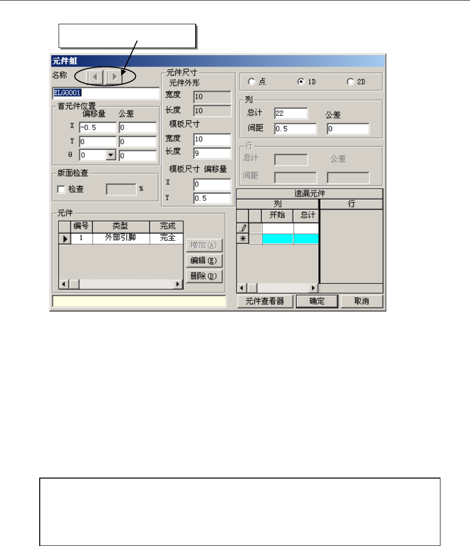 第 2 部 功能详解篇 第 6 章 通用图像 6-5 6-2-1 元件组 / 元件格式的制作 在图 6-2-2 的画 面中单击“ 追加”按钮,显 示如下画面。 图 6-2-1-1 元件组制作画面 1) 名称:请输入元 件组名,英文、 数字字符最 多 32 个。 2) 首元件位置:输 入由元件识别中 心位置到首元 件的距离。 ●偏移量 ◇ X , Y : 当为多引 脚元件时, 输入到首元件 的顶端中心的 距离; 当为复 合阵列元件时, 输…