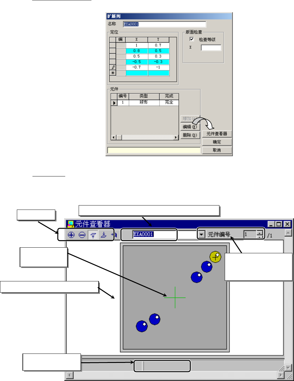 第 2 部 功能详解篇 第 6 章 通用图像 6- 18 从扩展列画面中调 出 单击扩展列画面 的“元件查看器 ”按钮。 画面显示例 显示扩展列数据 的配置图形。 用旋转控制器 移动元件编号 , 单击画面 上的要素, 所选择的要素 以黄色显示。( 未选择的要素以 兰色显示。) 在元件数据 中输入的元件外形 元件中心用十字 线表示 被选择的元 件坐标 工具栏 扩展列数据 组列表(仅显示) 被选择的元件编号和总 数 ( 1.0000 , 0…