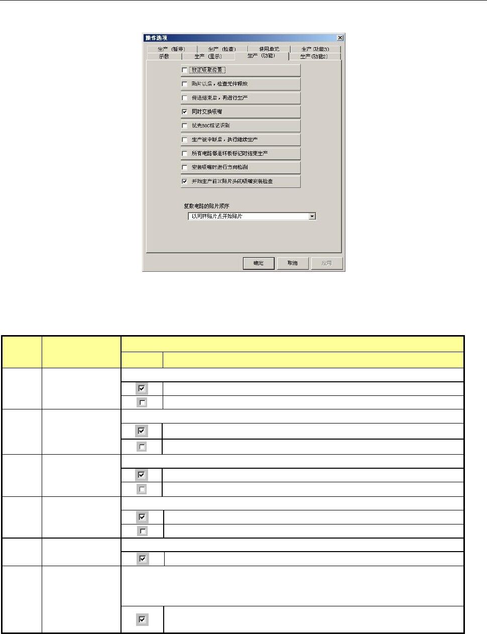 第 2 部 功能详细编 第 7 章 操作选项 7-6 7-2-3 生产的功能选项的设置 设置生产时的操 作。 图 7-2-3-1 生产的功能选项(显示 例 KE2080 ) 表 7-2-3-1 生产时的功能选项设 置项目的细节 和内容 序号 . 项目 内容 状态 动作及详细内容 1 校正吸取位置 设置是否执行吸 取位置校正。 根据定心结果对 吸取位置进行校正。 忽视元件数据指 定的“吸取位置校正 ” ,不执行校正。 2 贴片以后, 检查…