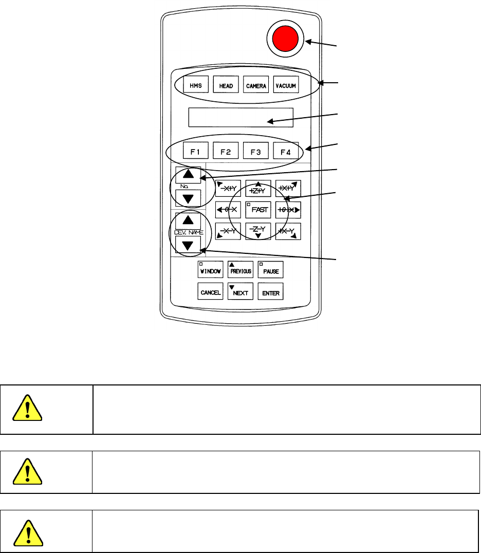 第 1 部 基本编 第 1 章 设备概要 1- 55 1-3-2-2 HOD :手动操作盘 HOD 主要用于示教 时直接操作各 轴。 图 1-3-2-2 HOD :手控 操作盘外观图 为了避免人身伤 害 , 在进行 HOD 操作过程中 , 切勿 将手放入装置 内部 , 也不要 将脸和头靠近装 置。 将 HOD 单元与主机连接时 , 请关闭主机电源。 HOD 单元背面贴有磁铁 , 如果使软盘等靠近 , 有可能使 数据丢失。 紧急 停止 L…