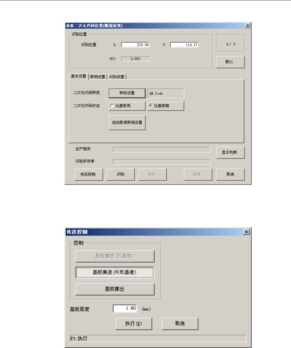 第 2 部 基本编 第 8 章 机器设置 8- 52 8-5-19 基板二次元代码位置设置 设置基板二次元 代码位置。 选择基板二次元 代码位置设置后 ,会显示如下 图的基板二次元 代码位置设置 对话框。 图 8-5-19-1 基板二次 元代码位置设 置对话框 选择「传送控制」后即 显示如下画 面。执行「基板搬进」,搬进所要生产 的基板后,摄像机会自 动移动到基板的 识别位置。 图 8-5-19-2 传送控制对话 框 ( 基板搬进 ) …