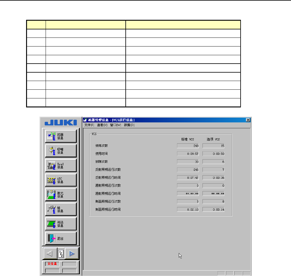 第 2 部 功能详细篇 第 10 章 设备运行信息 10 - 17 10-5-5 VCS 运行信息 从菜单栏中选择 “窗口 (W) ” / “图像” / “ VCS 运行信息”, 则显示图 10-5-5-1 。 No. 项目 内容 1 使用次数 使用 VCS 的累 计次数。 2 使用时间 使用 VCS 的累 计时间。 3 故障次数 VCS 发生 错误的累计次 数。 4 反射照明运 行次数 使用反射照明的累计次数 。 5 反射照明运 行时…