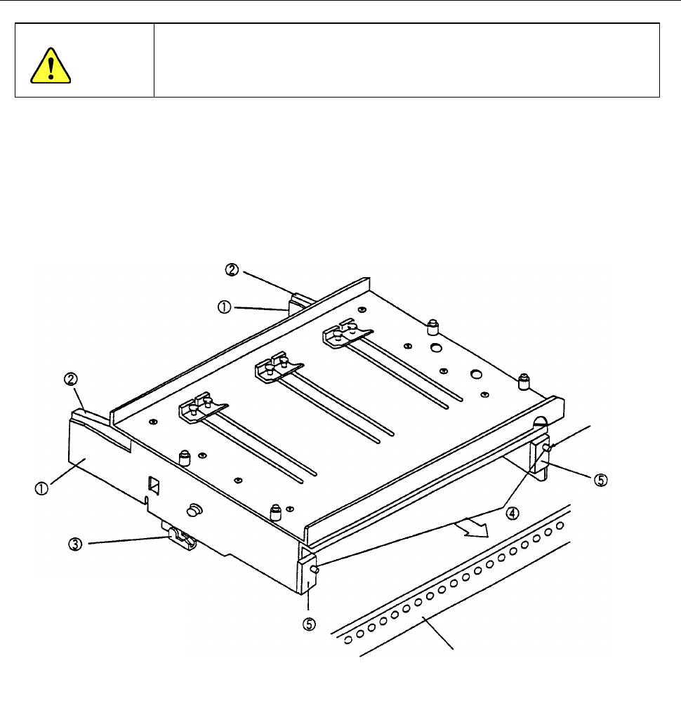 3) 在销④插入且前板⑤顶住固定板的位置上,放开边板①和锁紧杆②,用锁紧支架③固定。