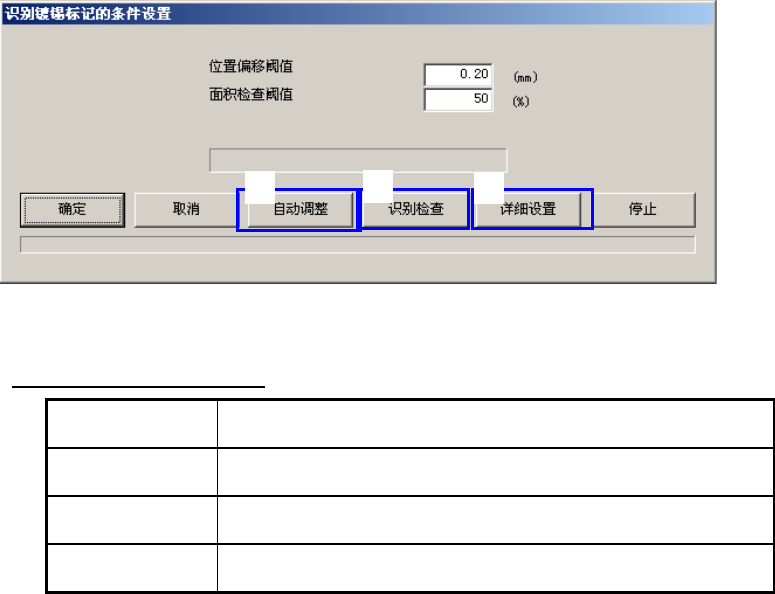 在[识别镀锡标记的条件设置] 画面上选择 [自动调整]按钮,可一边变更参数,一边反复进行识