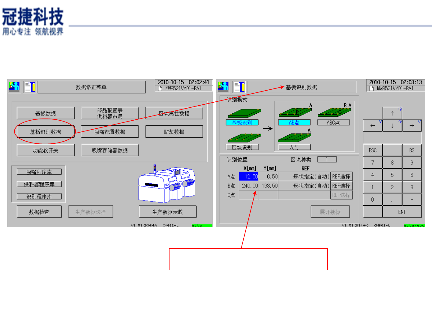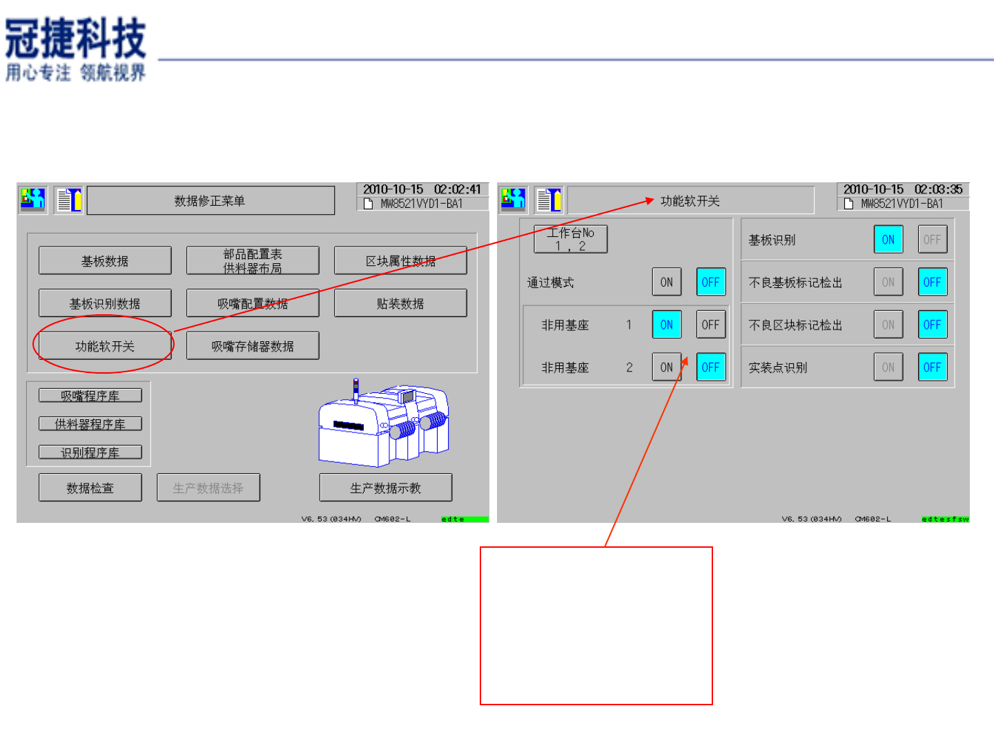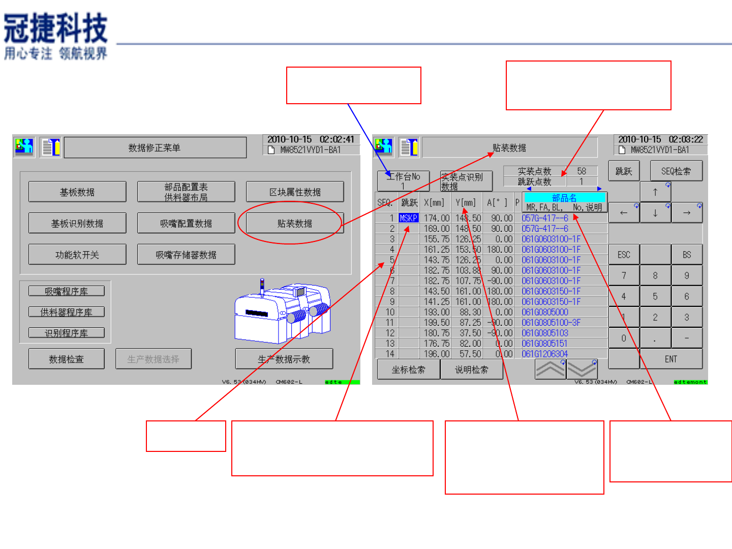 表示工作台序号 表示该工作台贴装 点数及被跳跃点数 . 表示点位 MSKP 表示跳点位 , 在切换生产 前要检查是否有跳点位 , 以免 漏件 . 表示贴装点位 X/Y 坐标 及贴装角度 , 操作员请勿 随意修改 , 如有问题请知 会技术人员修改 表示点位料号以及 相应点位名称 , 在第 几联片等 功能菜单介绍 --- 数据修正菜单