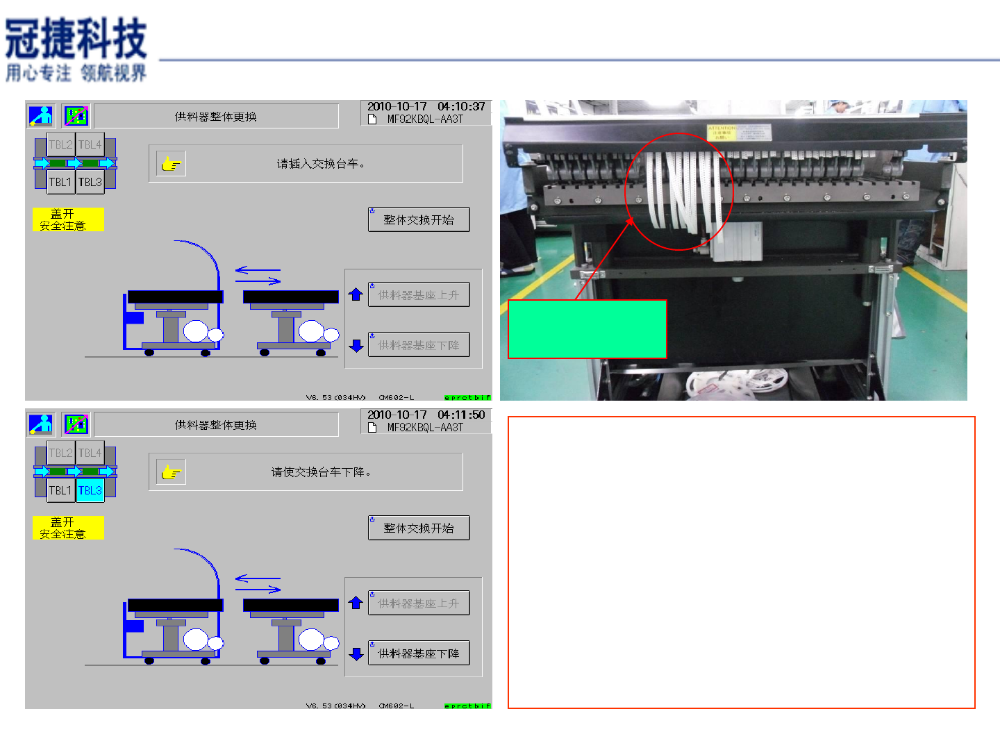 切换步骤 --- 更换料车 ( 以更 换 TBL3 为例) : 10. 插入料车 : 插入料 车前 应检 查料 的 编带 是否 太长 . 1 1. 选择 ” 供料器基座下降 ” ⑾ 编带太长 , 须剪掉 切换步骤介绍 --- 更换料车