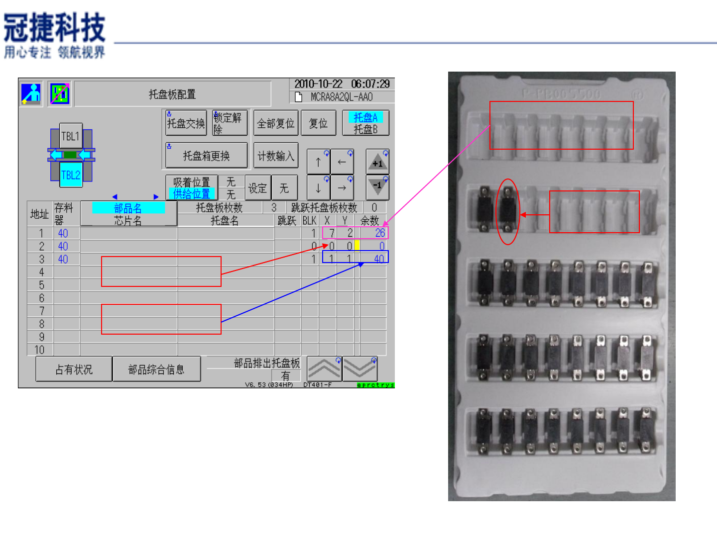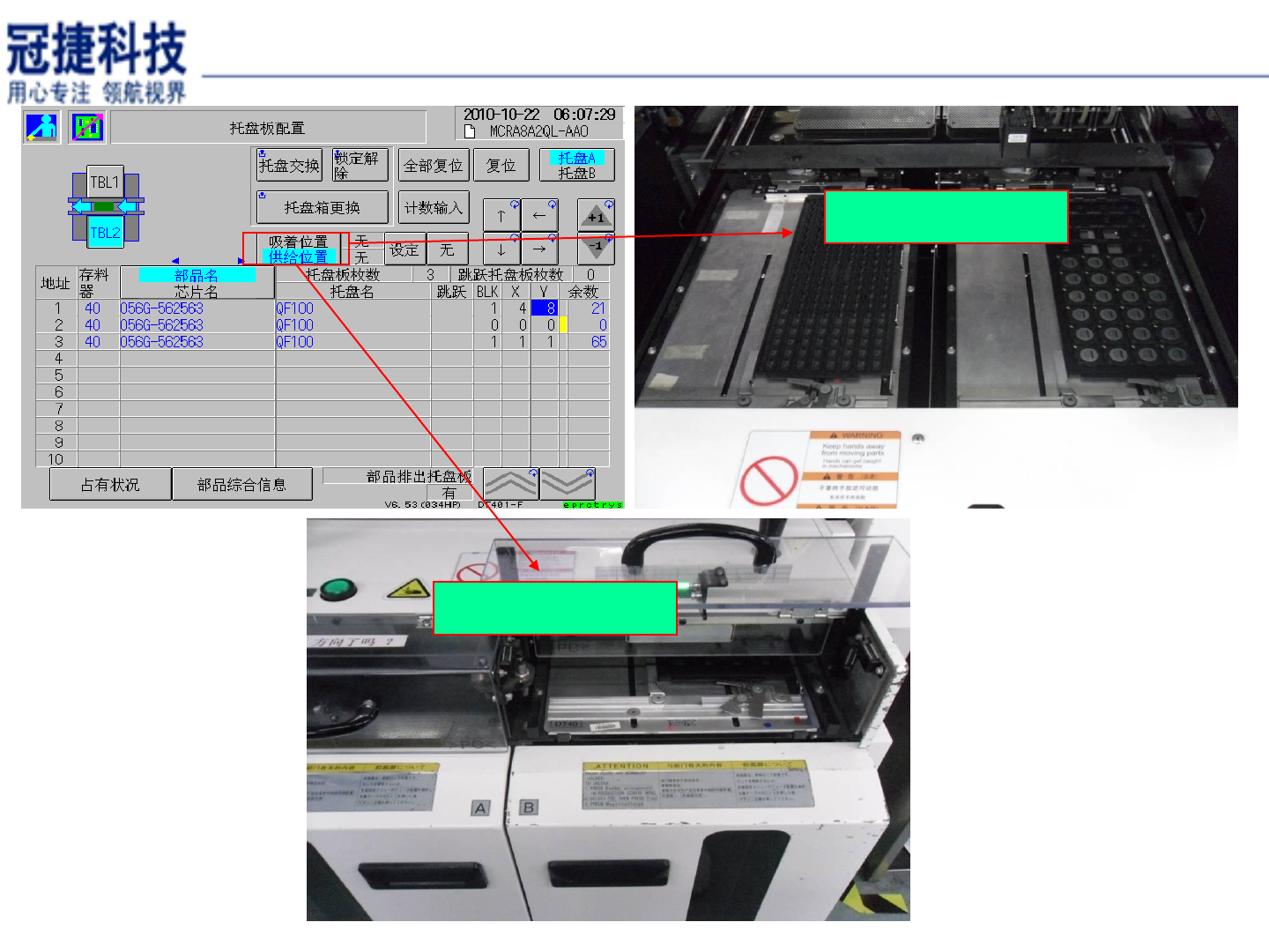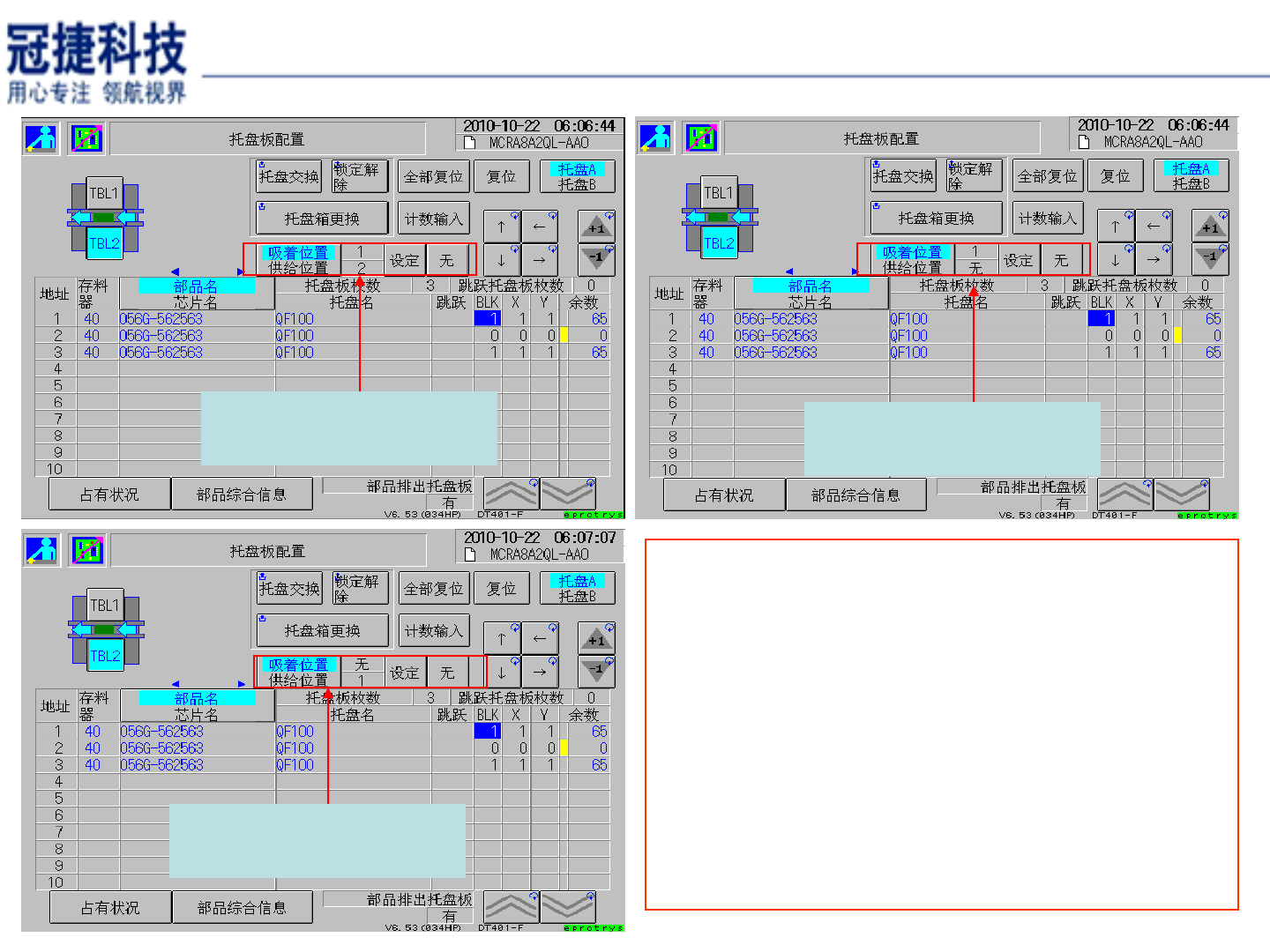 表示吸着位置是第 1 盘 , 供给位置是第 2 盘 . 表示吸着位置是第 1 盘 , 供给位置是空盘 . 表示吸着位置是空盘 , 供给位置是第 1 盘 . 吸着位置与供给位置的设置要与实际设置相 符 , 否则在生产中会报错 . 如需设置时可以按 ” 设定 ” 与 ” 无 ” 进行正确的 设置 . DT401 托盘单元介绍
