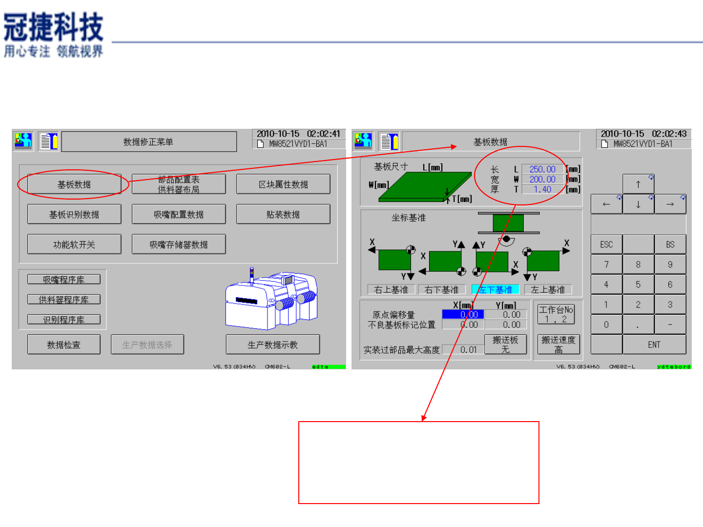 主要用于查看基板长 , 宽 , 厚 , 其他数据请勿随意修改 . 功能菜单介绍 --- 数据修正菜单