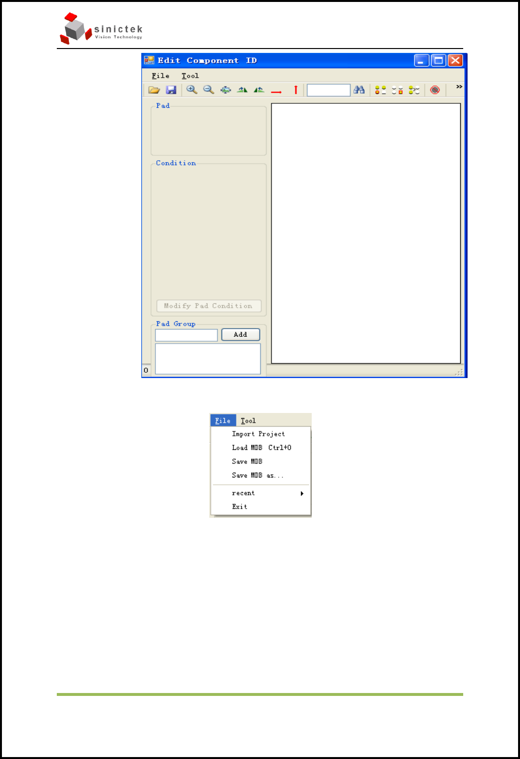 InSPIr e-510a 操作手册 思泰克光电科 技有限公 司 P age 15 Copyrigh t by Sinic-T ek Vision T echnology Co., Lt d. 6.3.4 点击 File 打开菜单,如图所示: -Import Project 导入 Gerber ; -Load MDB 导入 Job ; -Save MDB 保存 Job ; -Save MDB 文件另存为; -Recent 最近操作; -…