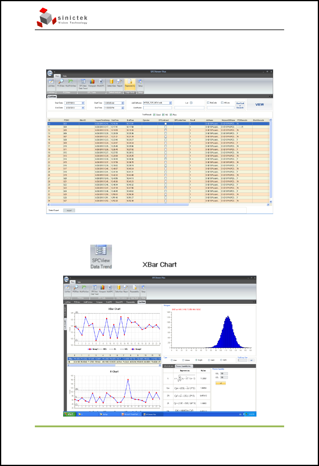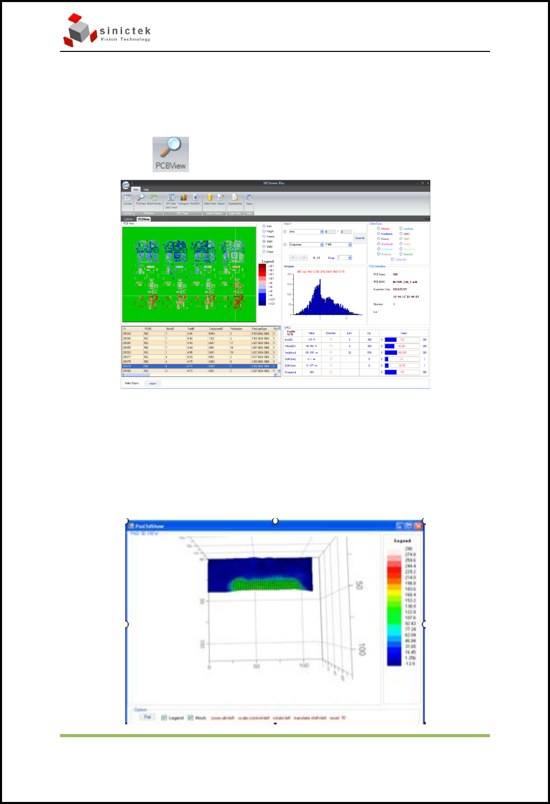 InSPIr e-510a 操作手册 思泰克光电科 技有限公 司 P age 21 Copyrigh t by Sinic-T ek Vision T echnology Co., Lt d. 6.4 过程控制软件 SPC 6.4.1 SPC 的描述: SCP 是对检测后得到焊盘的数据进行分析和查看。 6.4.2 打开软件,界面如下图: 6.4.3 选择 检测的结束或开始日期,打开指定的测试数据。 然后点击 VIEW 可以看到上图的界面…