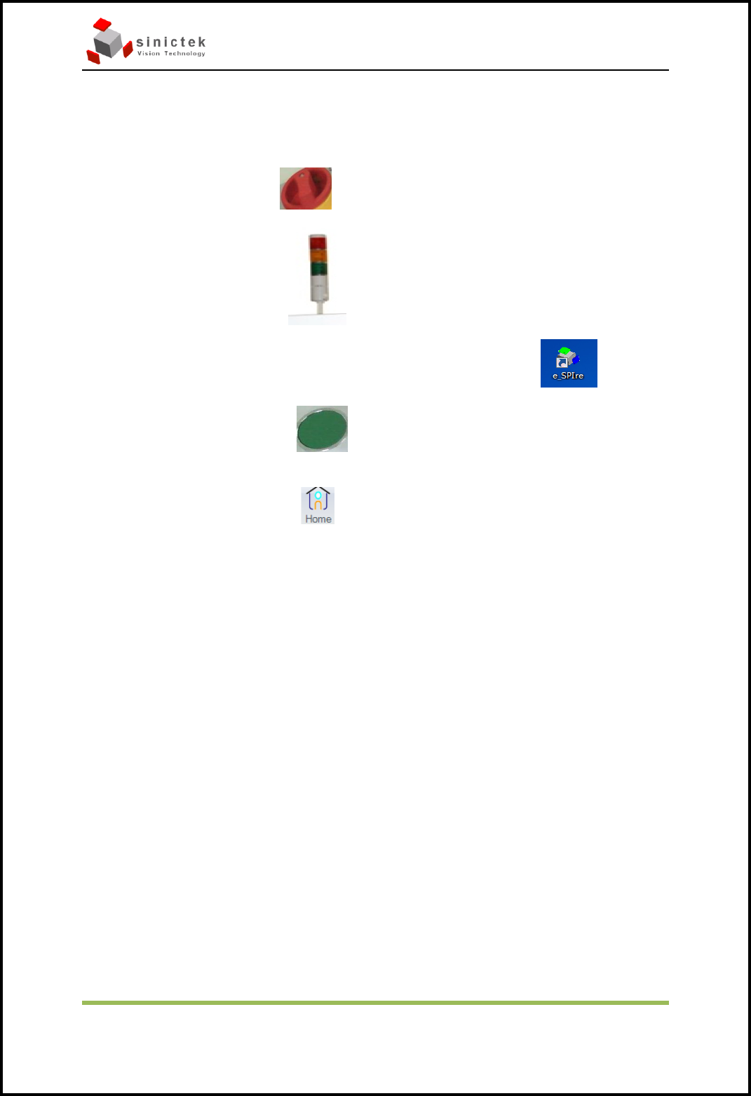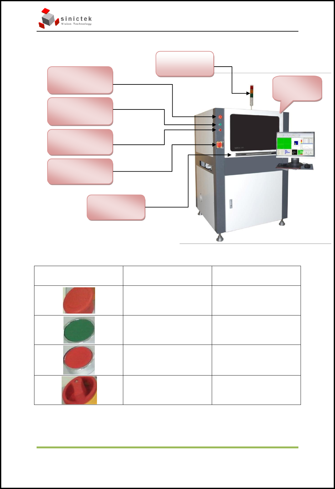 InSPIr e-510a 操作手册 思泰克光电科 技有限公 司 P age 6 Copyrigh t by Sinic-T ek Vision T echnolog y Co., Lt d. 二. 设备开关及指示灯 示例图片 器件名称 工作状态 紧急停止开关 按下此开关, 机器的工作 会停止 运行开关(带绿色灯) 按下此键, 绿色运行指示 灯打开 停止开关 按下此键, 绿色运行指示 灯关闭 机器电源开关 顺时针方向 90 度旋转电 源…