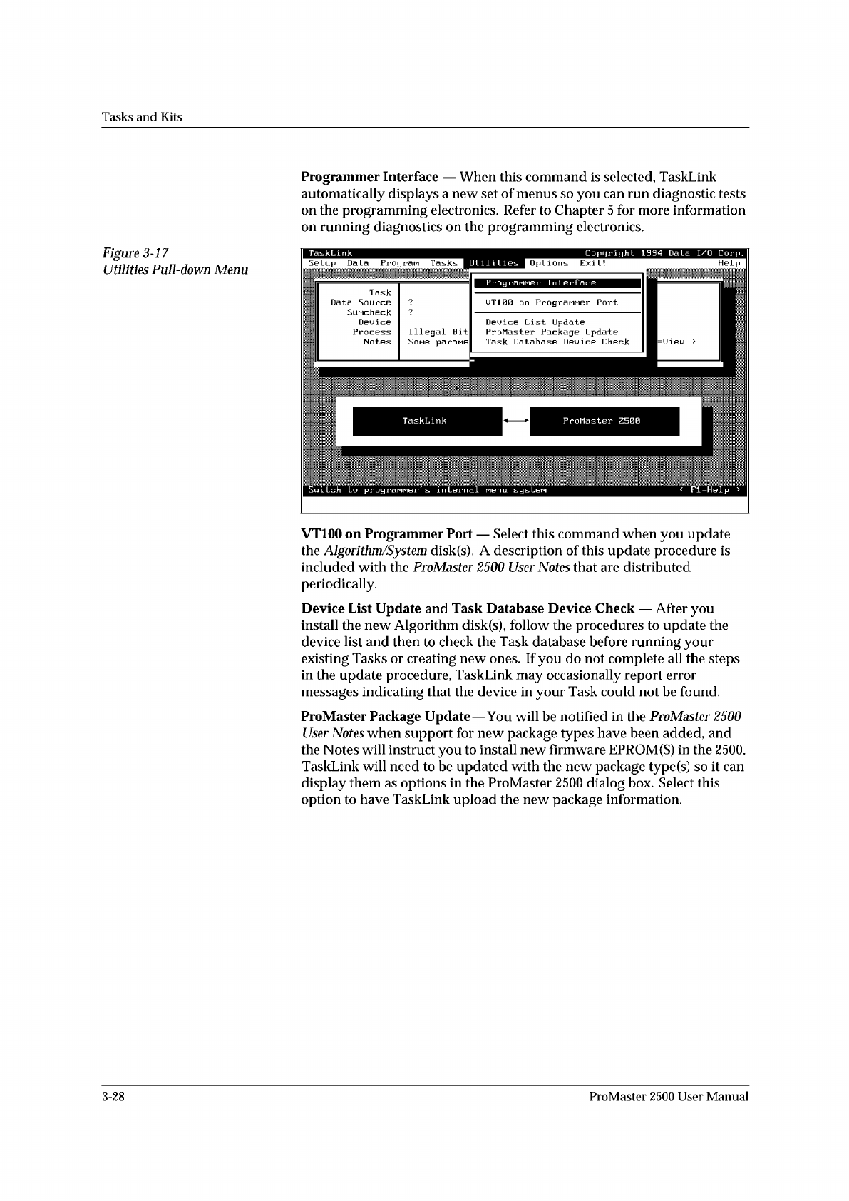 Tasks and Kits Figure 3-17 Utilities Pull-down Menu Programmer Interface — When this command is selected, TaskLink automatically displays a new set of menus so you can run diagnostic tests on the programming electronics.…