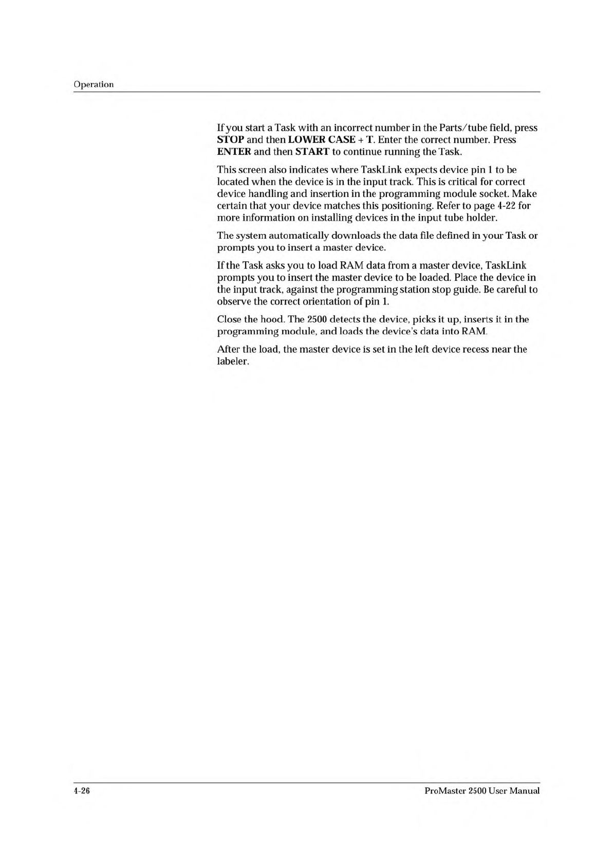 Operation If you start a Task with an incorrect number in the Parts /tube field, press STOP and then LOWER CASE + T. Enter the correct number. Press ENTER and then START to continue running the Task. This screen also ind…