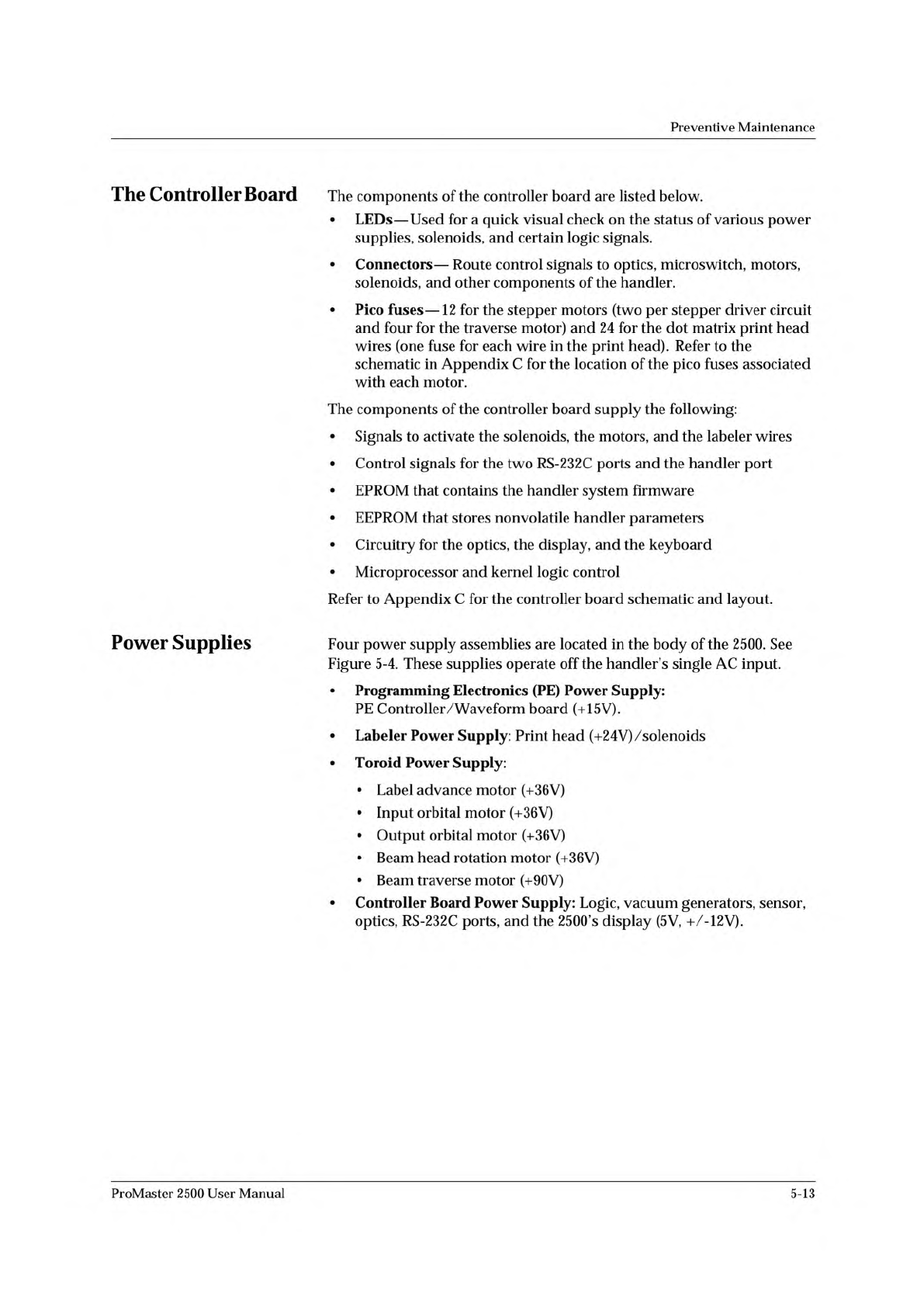 Preventive Maintenance The Controller Board The components of the controller board are listed below. • LEDs — Used for a quick visual check on the status of various power supplies, solenoids, and certain logic signals. •…