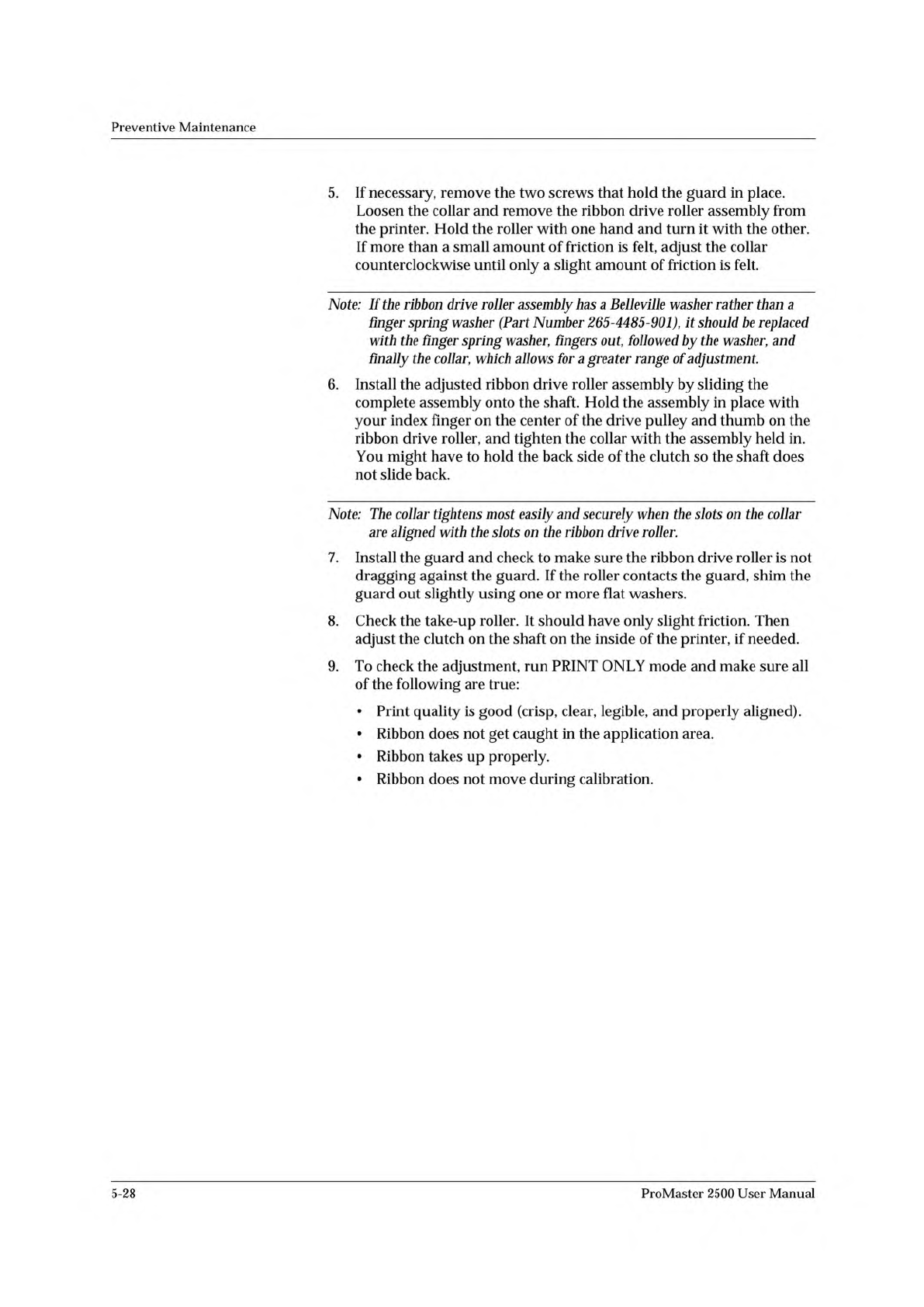 Preventive Maintenance 5. If necessary, remove the two screws that hold the guard in place. Loosen the collar and remove the ribbon drive roller assembly from the printer. Hold the roller with one hand and turn it with t…