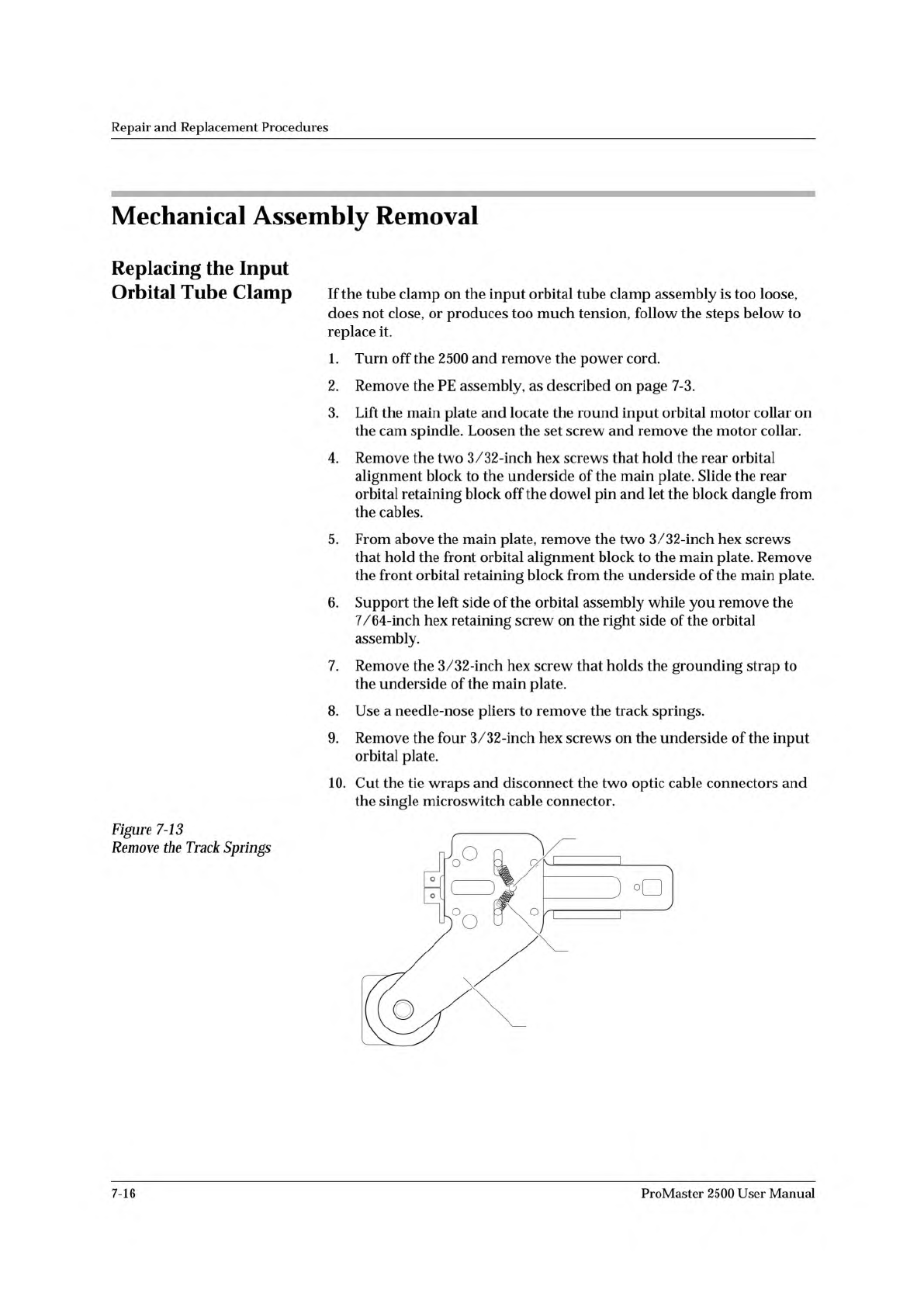 2308-1 INPUT ORBITAL ASSEMBLY SPRING (1 of 2) CENTER POST Repair and Replacement Procedures Mechanical Assembly Removal Replacing the Input Orbital Tube Clamp Figure 7-13 Remove the Track Springs If the tube clamp on the…