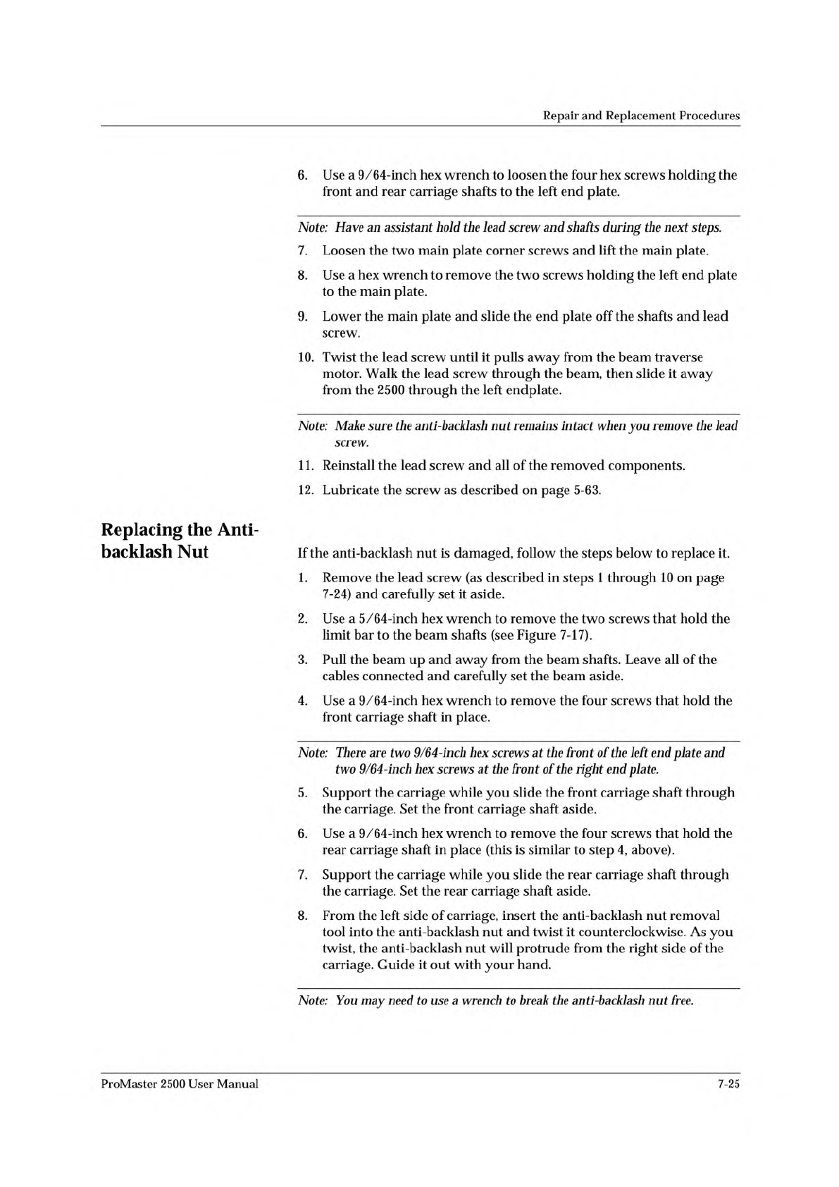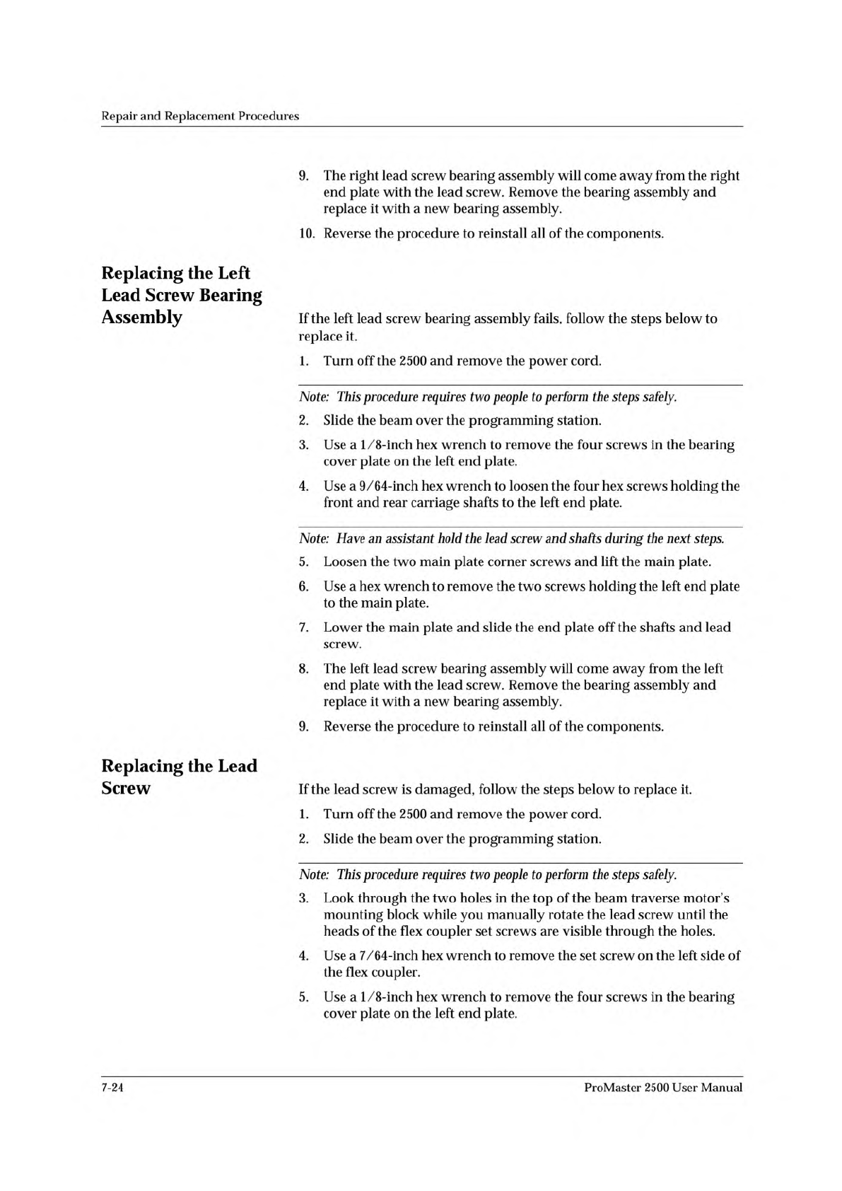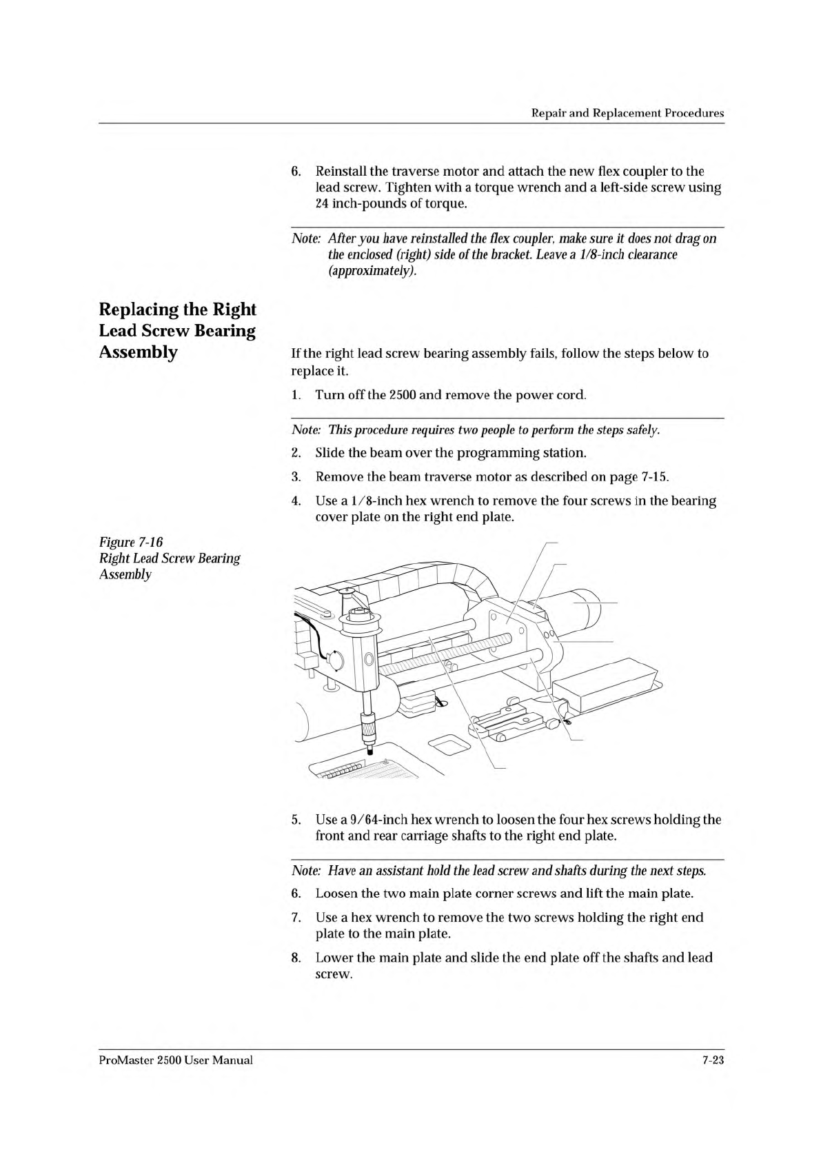 Repair and Replacement Procedures 9. The right lead screw bearing assembly will come away from the right end plate with the lead screw. Remove the bearing assembly and replace it with a new bearing assembly. 10. Reverse …