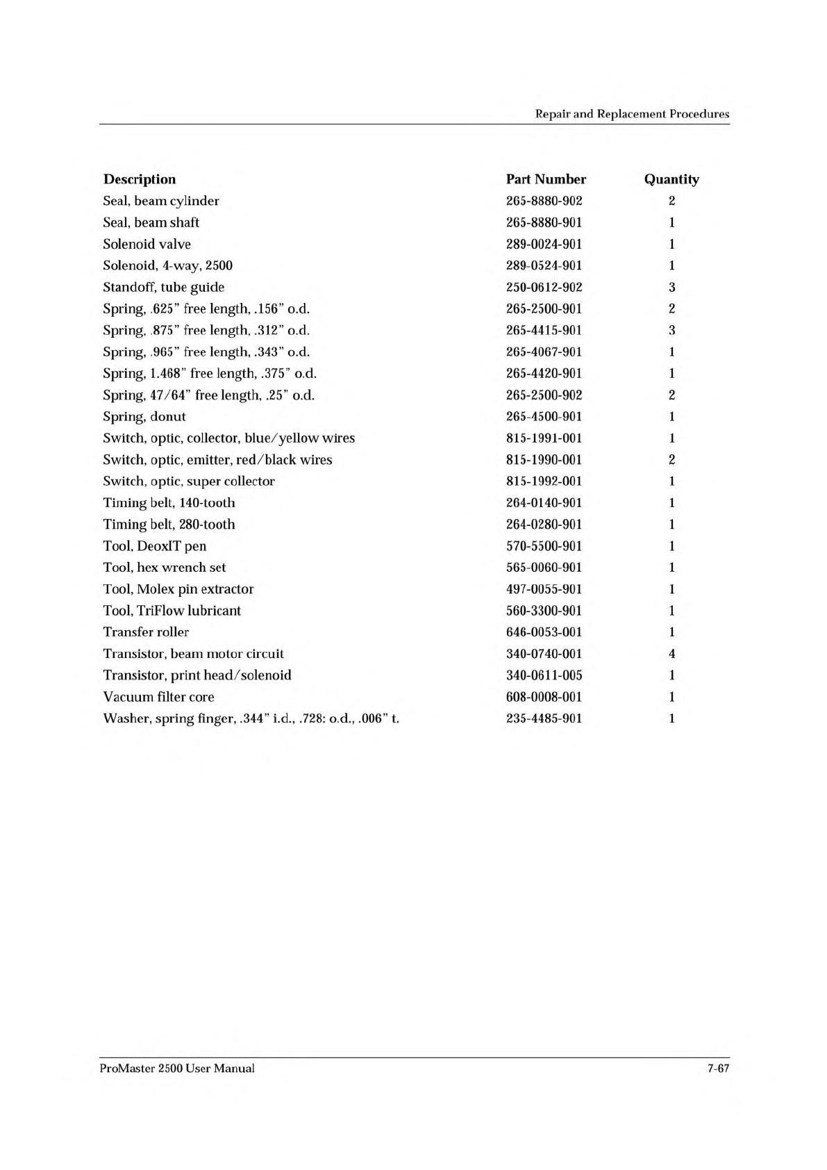 Repair and Replacement Procedures ProMaster 2500 Thermal Printer Standard Spares Kit (Part Number: 952-0156-002) Description Part Number Quantity Air cylinder, shutter/ thermal 298-5500-901 1 Air cylinder, programming mo…