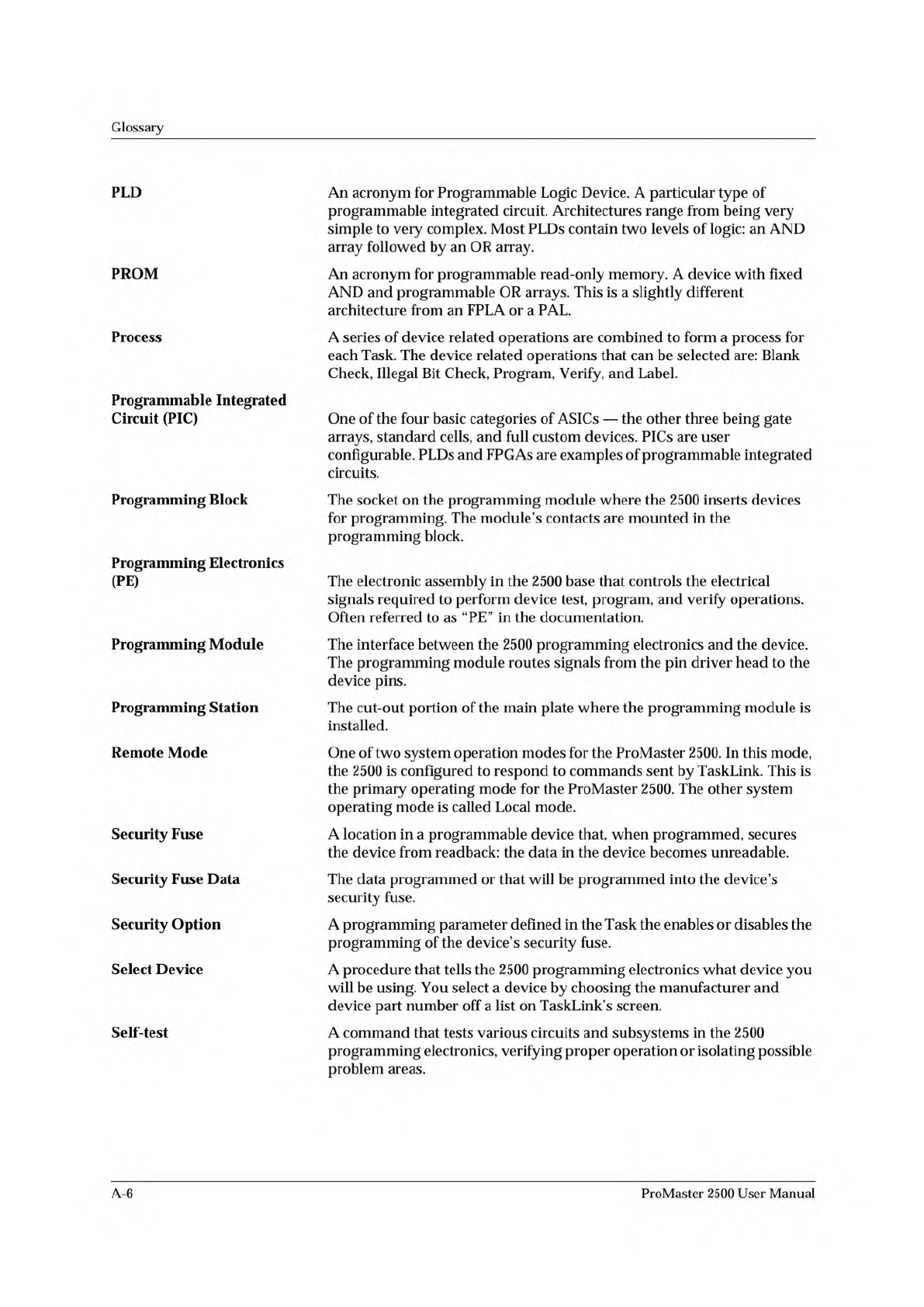 Glossary Logic Verification After programming a device, you can select test vector verification, fuse verification, or both types of verification. Main Plate The metal plate on which the tracks, beam, tube holders, and b…