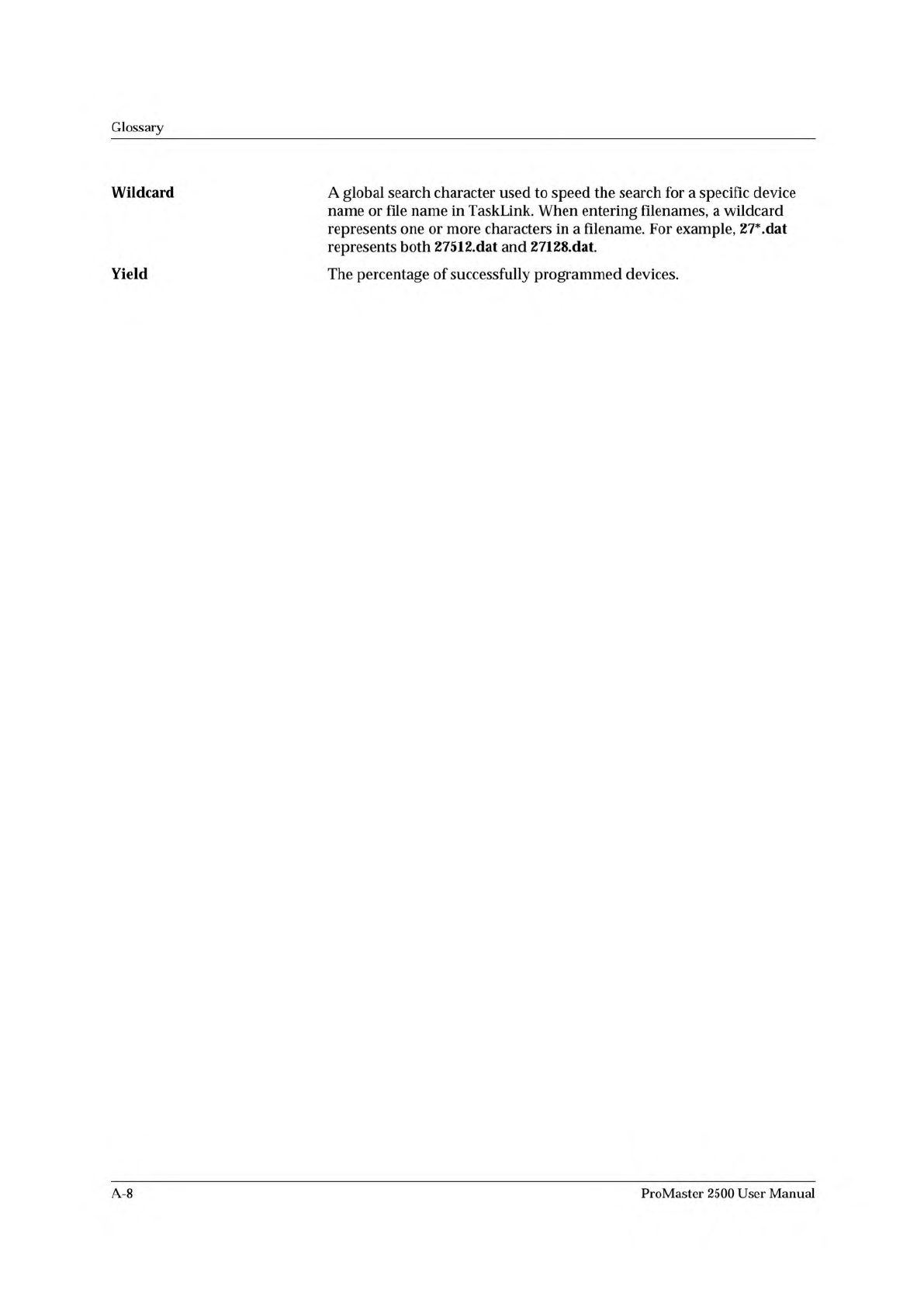Glossary Wildcard A global search character used to speed the search for a specific device name or file name in TaskLink. When entering filenames, a wildcard represents one or more characters in a filename. For example, …