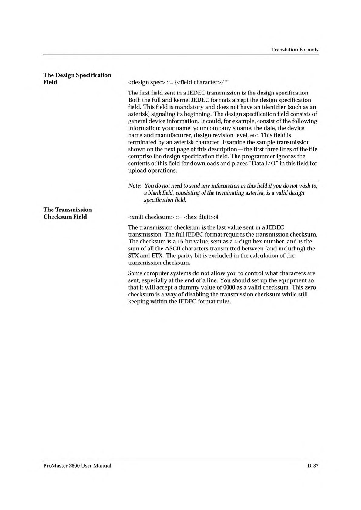 Translation Formats The Design Specification Field < design spec〉 :: = {<field character〉}'*' The first field sent in a JEDEC transmission is the design specification. Both the full and kernel JEDEC forma…