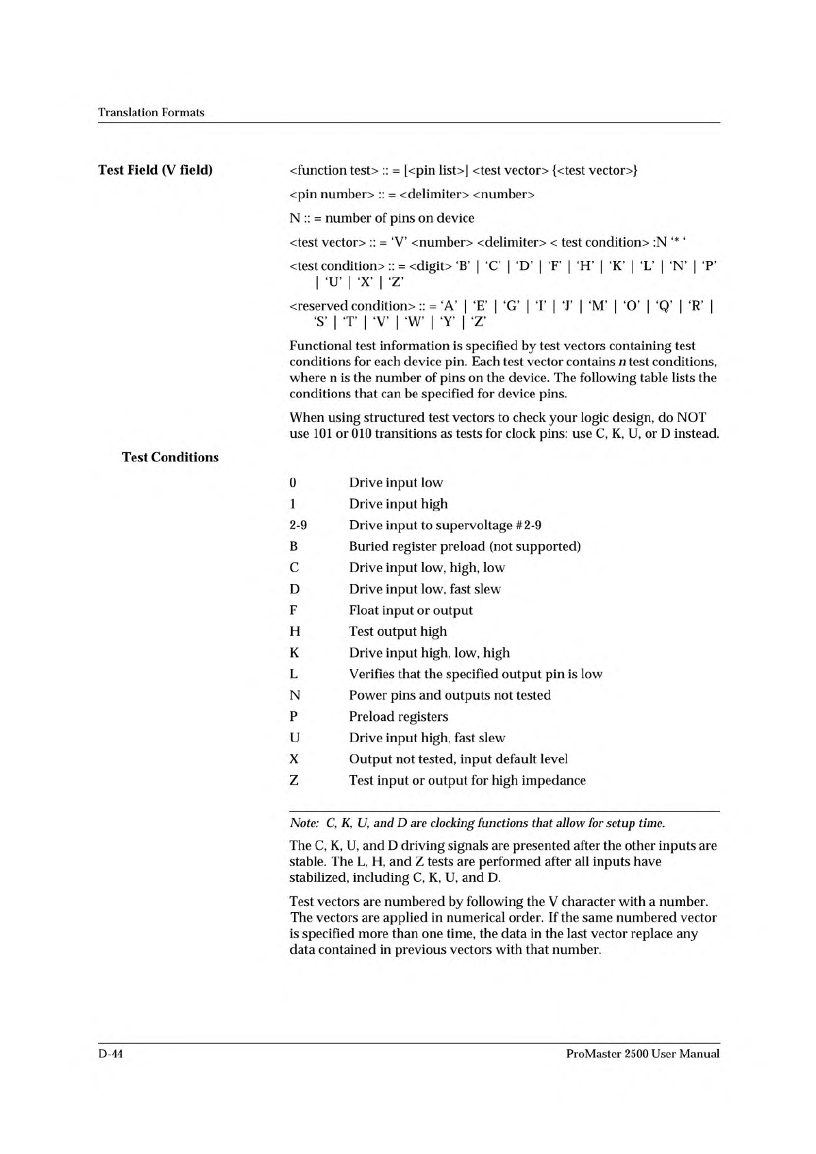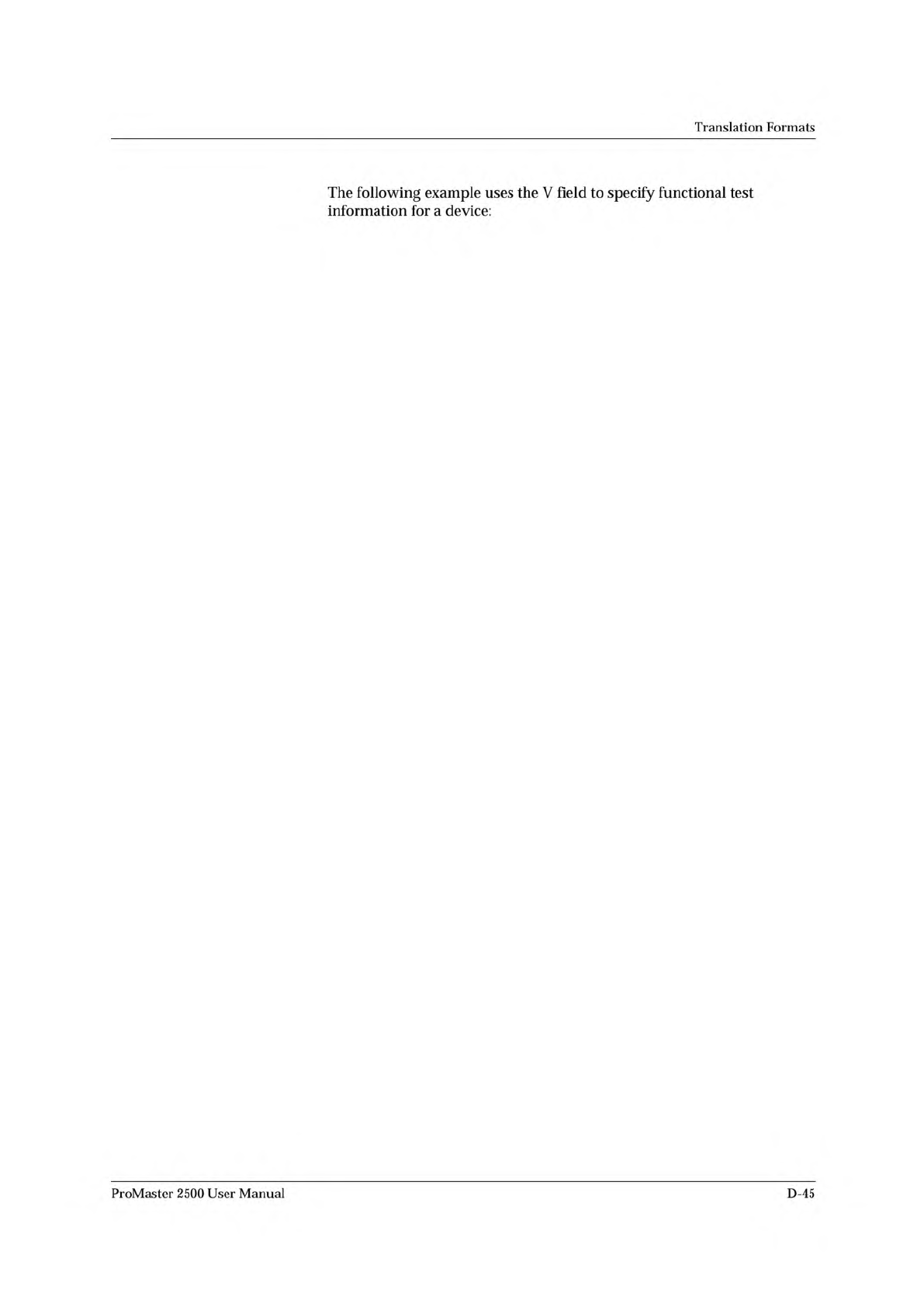 V0001C01010101NHLLLHHLH LN* V0002C01011111NHLLHLLLH LN* V0003C10010111NZZZZZZZZ ZN* V0004C01010100NFLHHLFFL LN* Translation Formats The following example uses the V field to specify functional test information for a devi…