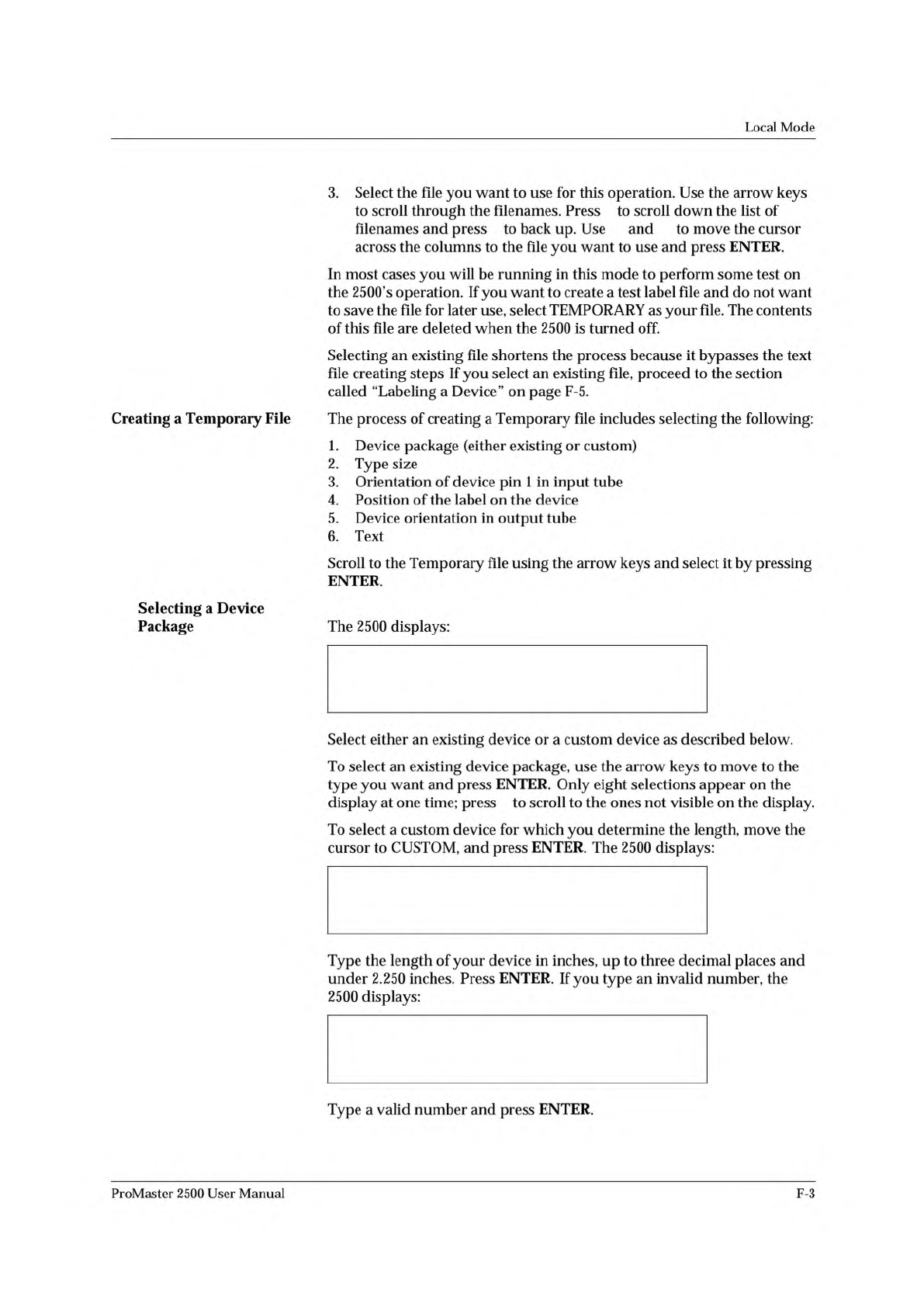 * * PROMA STER 2500 MAIN MENU * * ENTER THE NUM BER OF THE DESIRED FUNCTION 1 - OPERATION S 3 - SYSTEM SETUP 2 - FILE UTIL ITIES 4 - DIAGNOSTICS * * * OPERATIONS MENU * * * 1 - PROGRAM/TEST & LABEL 4 - LABEL ONLY 2 -…