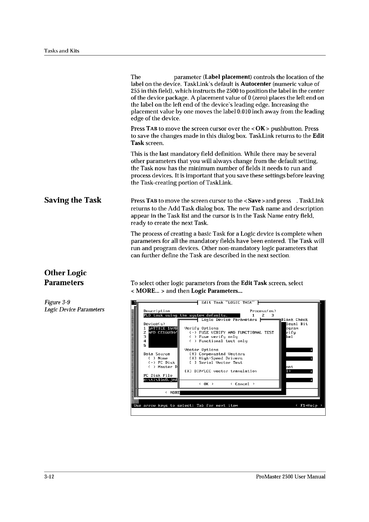 Placement ↵ ↵ Tasks and Kits Saving the Task Other Logic Parameters Figure 3-9 Logic Device Parameters The parameter (Label placement) controls the location of the label on the device. TaskLink's default is Autocent…
