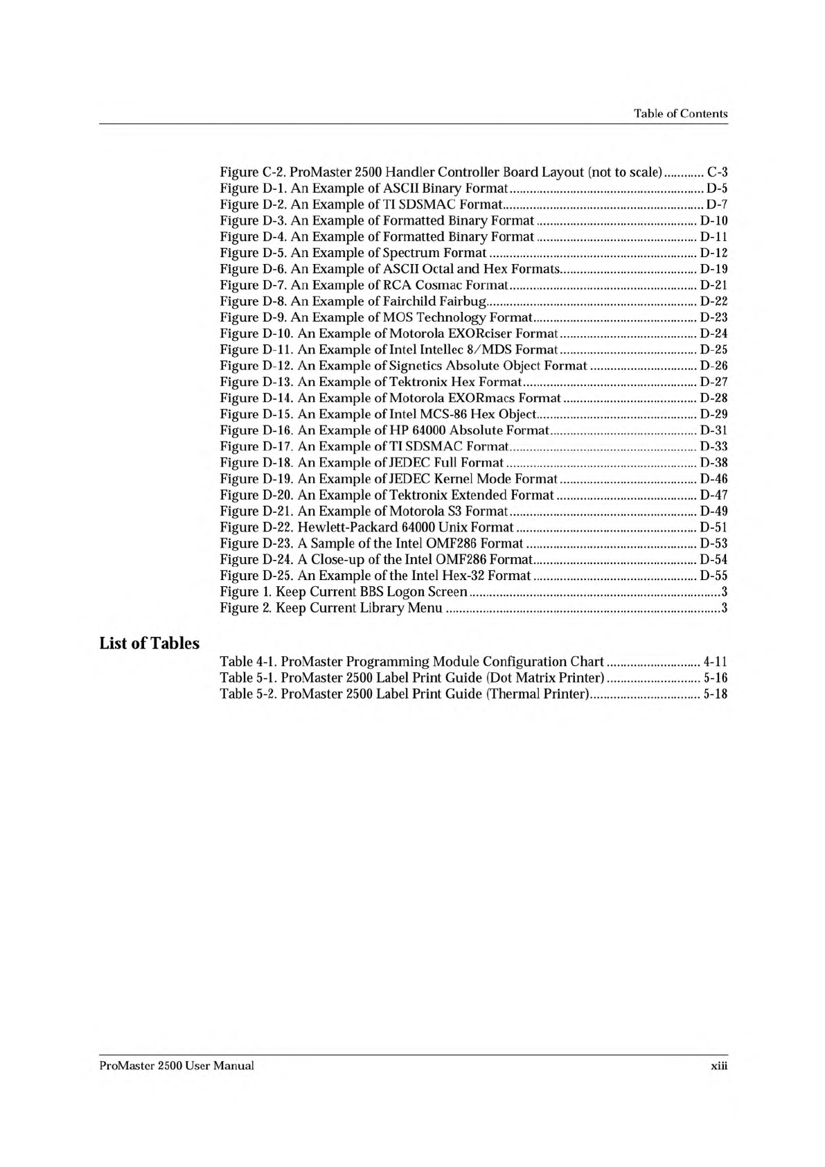 Table of Contents Figure C-2. ProMaster 2500 Handler Controller Board Layout (not to scale) C-3 Figure D-l. An Example of ASCII Binary Format D-5 Figure D-2. An Example of TI SDSMAC Format D-7 Figure D-3. An Example of F…
