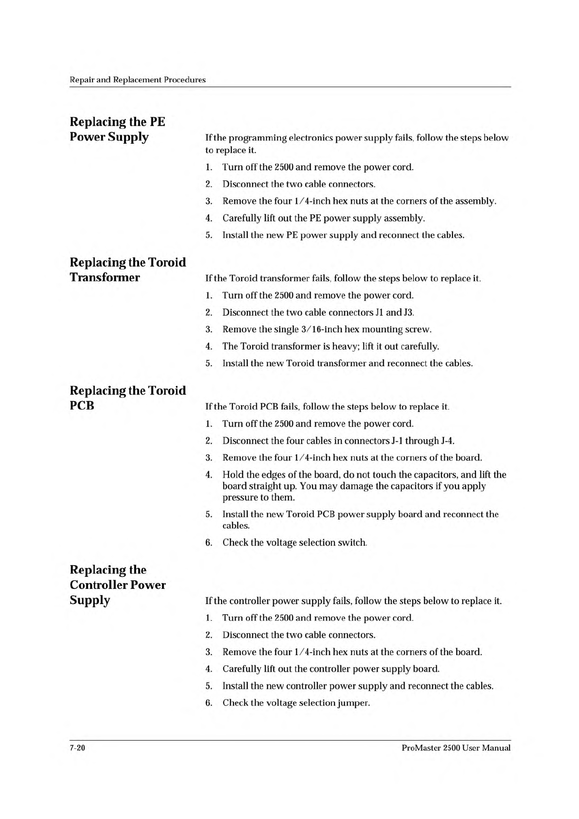 Repair and Replacement Procedures Replacing the PE Power Supply If the programming electronics power supply fails, follow the steps below to replace it. 1. Turn off the 2500 and remove the power cord. 2. Disconnect the t…